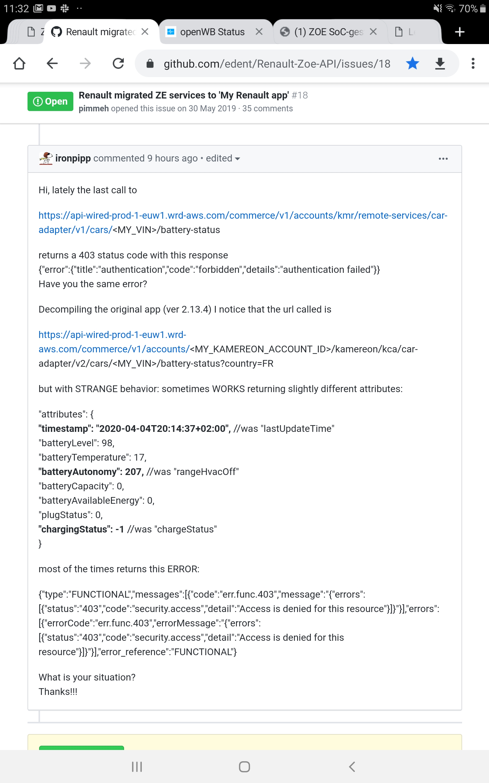 {"data":{"type":"Car","id":"xxxxxxxxxxxxxxx","attributes":{"timestamp":"2020-04-05T10:53:48+02:00","batteryLevel":100,"batteryAutonomy":210,"batteryCapacity":0,"batteryAvailableEnergy":0,"plugStatus":0,"chargingStatus":-1.0}}}