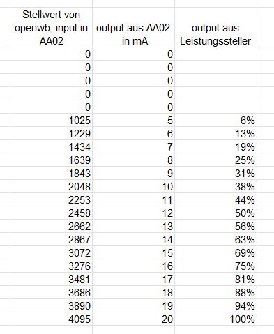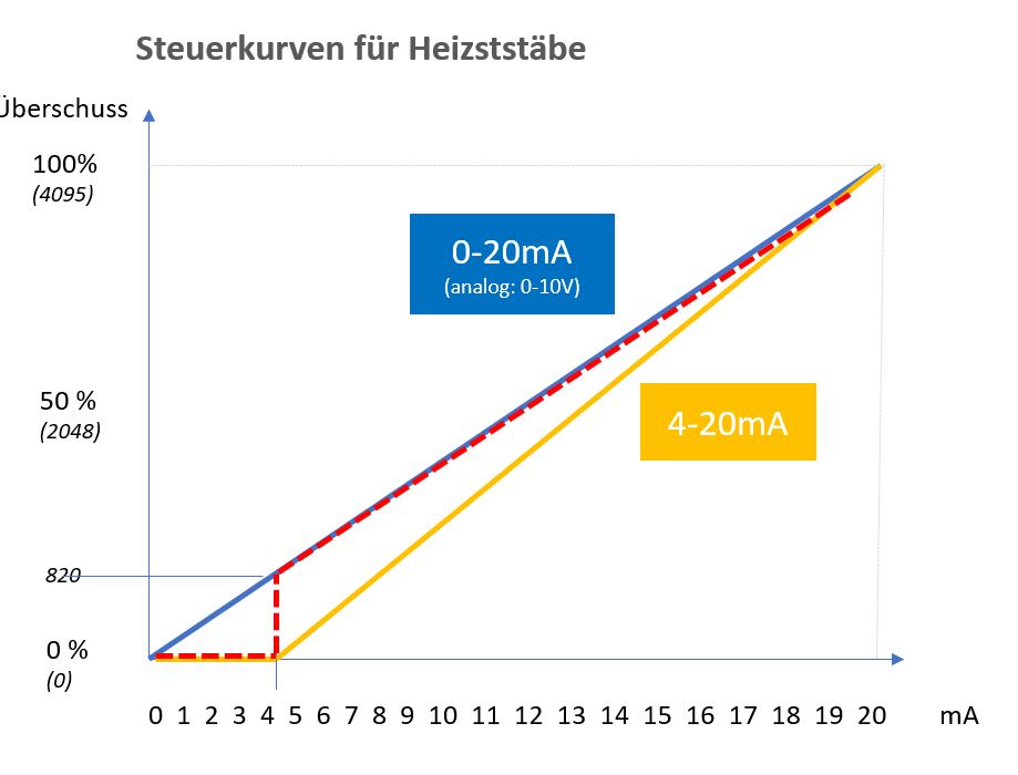 rq = client.write_register(0x01f4, ausgabe, unit=1)Für meinen konkreten Fall, wo der Aktor (=Heizstab) vollkommen linear regeln kann entspricht das meinem Dafürhalten nicht der korrekten Ansteuerung, da die Kurve erst bei 4mA losgeht und dann bis 20mA linear hochregelt. Idealerweise würde diese Umsetzung im AA02 Kovnerter passieren, ist aber leider nicht so. Deshalb die Bitte/Idee ob das OpenWB eine Ebene davor regelt. Wenn dann nicht mehr 4095 Stellwerte sondern nur mehr 3275 (4095-820) vorhanden sind um die Kurve abzubilden ist vielleicht die Auflösung nicht mehr ganz so genau, aber das ist (wie sagt man so schön) wurscht. Also in kurz: die OpenWB schickt eine lineare Kurve welche bei 0% mit 820 beginnt und bei 100% mit 4095 endet.