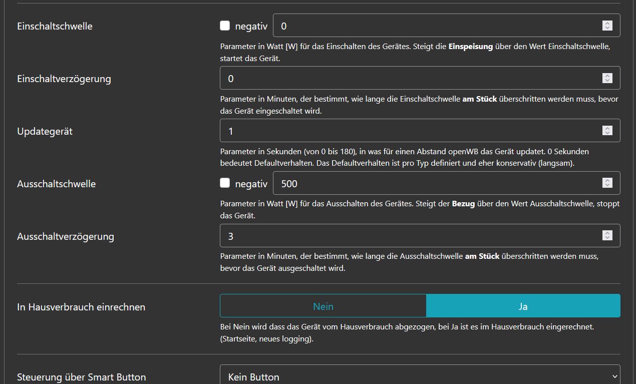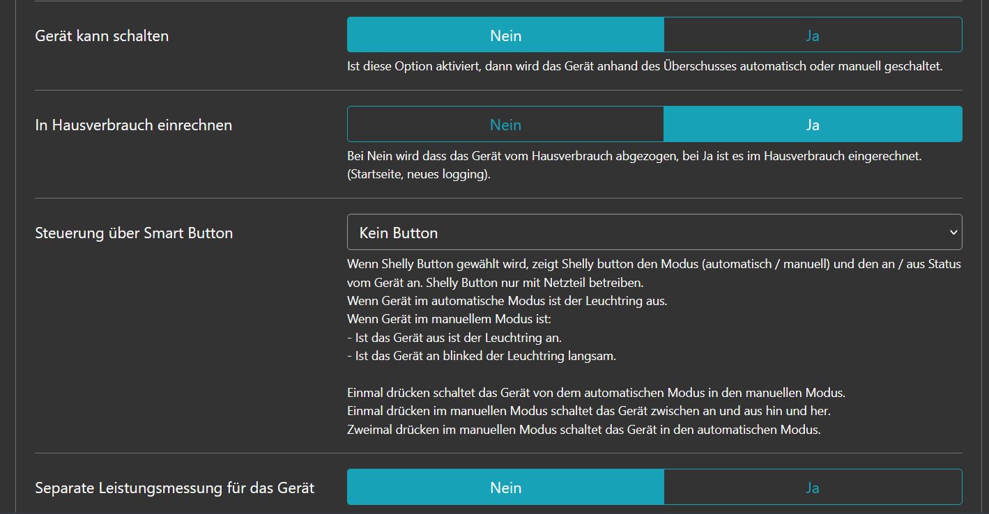 Egal wie ich rumkonfigurieren, auf "volle Leistung" geht es nur für ein paar Sekunden, dann springt es wieder zurück. Vielleicht habe ich ja auch einen Denkfehler: Wie müsste "Gerät kann schalten" konfiguriert sein (habe da auch schon alles ausprobiert)? Brauche ich vielleicht zwingend eine Leistungsmessung (also dass der Heizstab auch noch einen Strommesser braucht, der die Daten an openWB leitet)