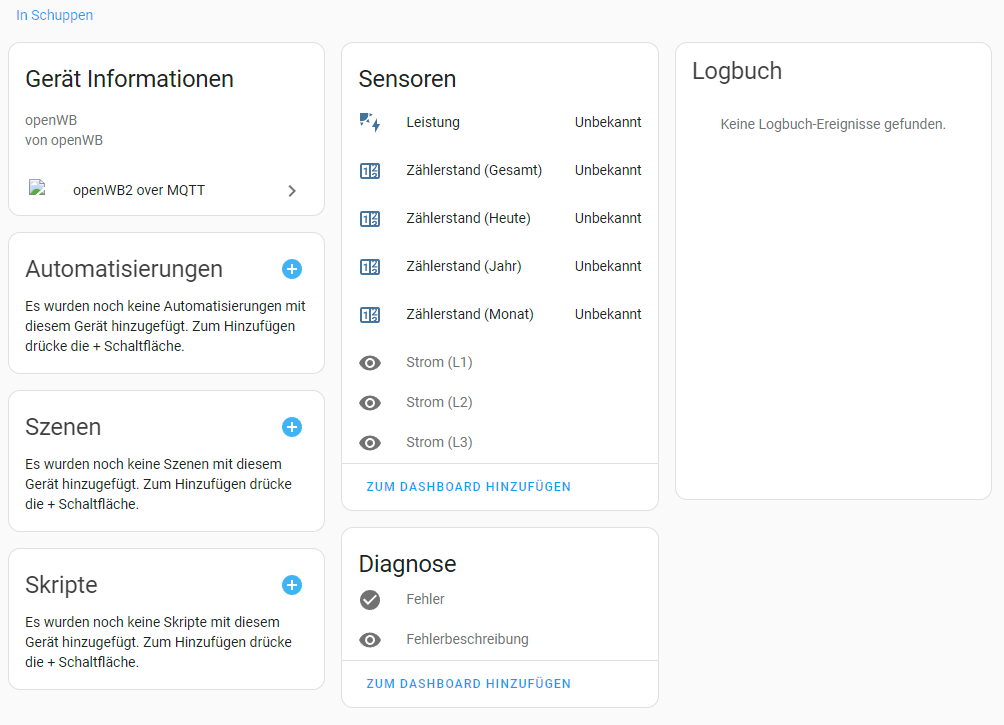 Mosquitto läuft, alle Topics (1x Chargepoint, 2x PV, 1x Counter) werden richtig von der OpenWB an HA gegeben (sehe per MQTT Explorer alle Infos auf dem HA Broker) aber wenn ich ein Gerät hinzufüge (egal welches) werden keine Werte angezeigt.