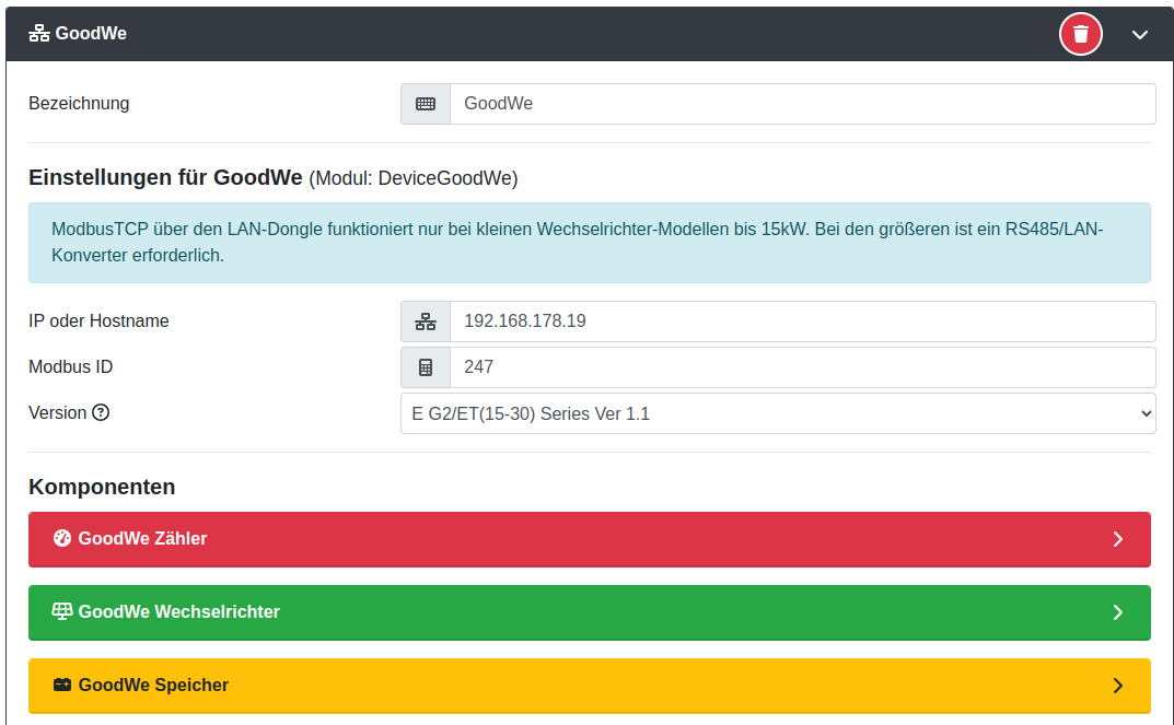 ich habe seit heute den GoodWe GW6.5K-ET im Einsatz. Jetzt wollte ich den WR in meiner OpenWB Konfig mit aufnehmen und habe festgestellt, dass das gar nicht so ohne Weiteres geht. Mit dabei war das WiFi Kommunikationsmodul. Anscheinend ist aber nicht sicher gestellt, dass das auch mit dem WiFi/LAN Adapter funktioniert. Jetzt bin ich über diesen Beitrag gestolpert. Hier wird eine direkte ModBus Anbindung beschrieben.