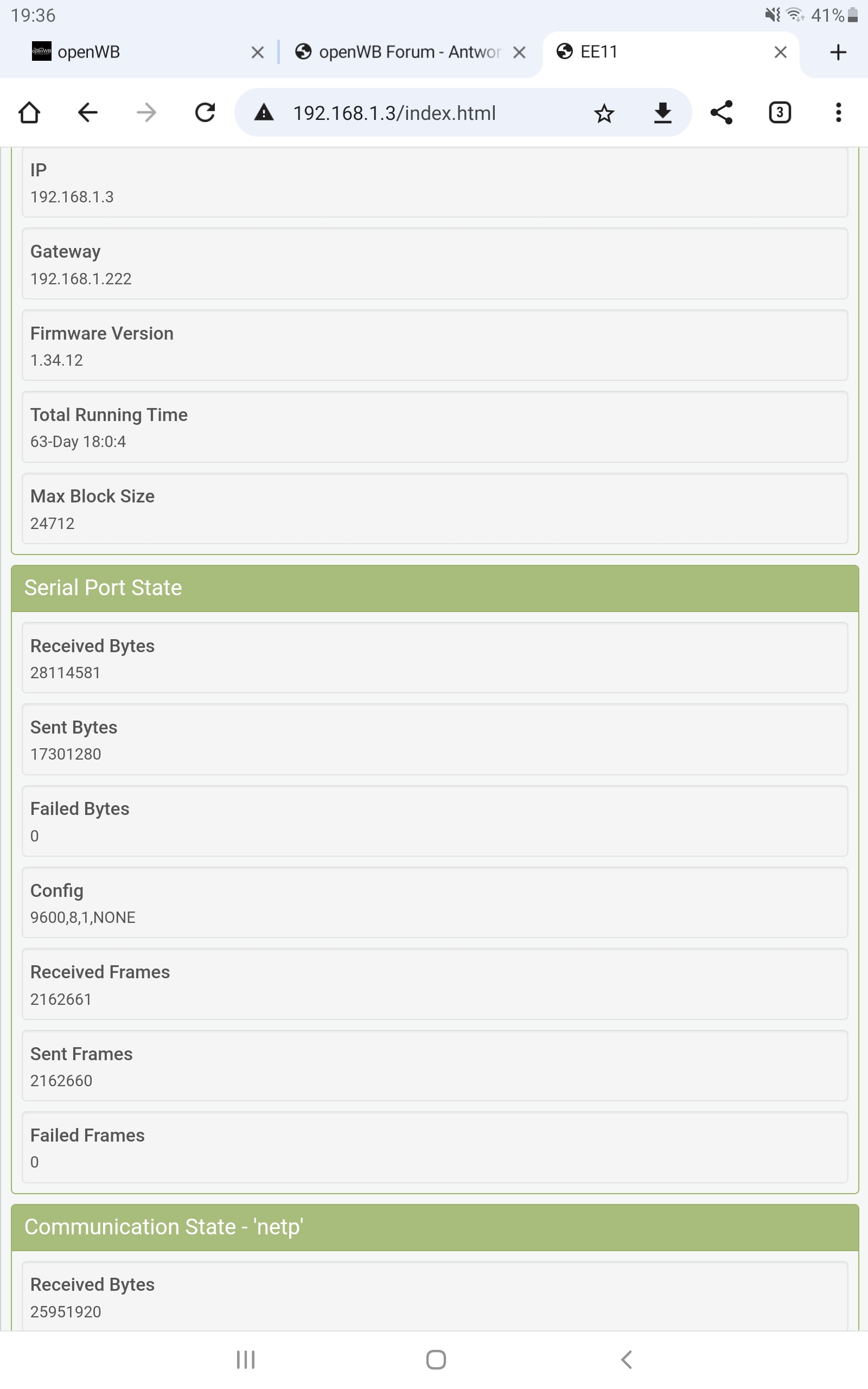 Das weiss ich nicht, wie ich das kontrollieren kann. Die Statusseite des PE11 zeigt folgendes Bild: Da ich das Teil heute Nachmittag frisch gebootet hatte, gehe ich davon aus, dass ein Datenaustausch stattfindet. Der SDM72 (gleiche Register wie der 630er, verhält sich mit der separaten SW auch identisch) ist ja das einzige Gerät am seriellen Bus. (mit der separaten SW kann ich den Zähler abfragen und er zeigt bei jeder Abfrage leicht unterschiedliche Messwerte. Deutet für mich darauf hin, dass die Verbindung zwischen Messgerät und PE11 funktioniert.)Wenn du im browser auf den pe11 gehst findet ein Transfer zwischen dem pe11 und dem sdm630 statt ?