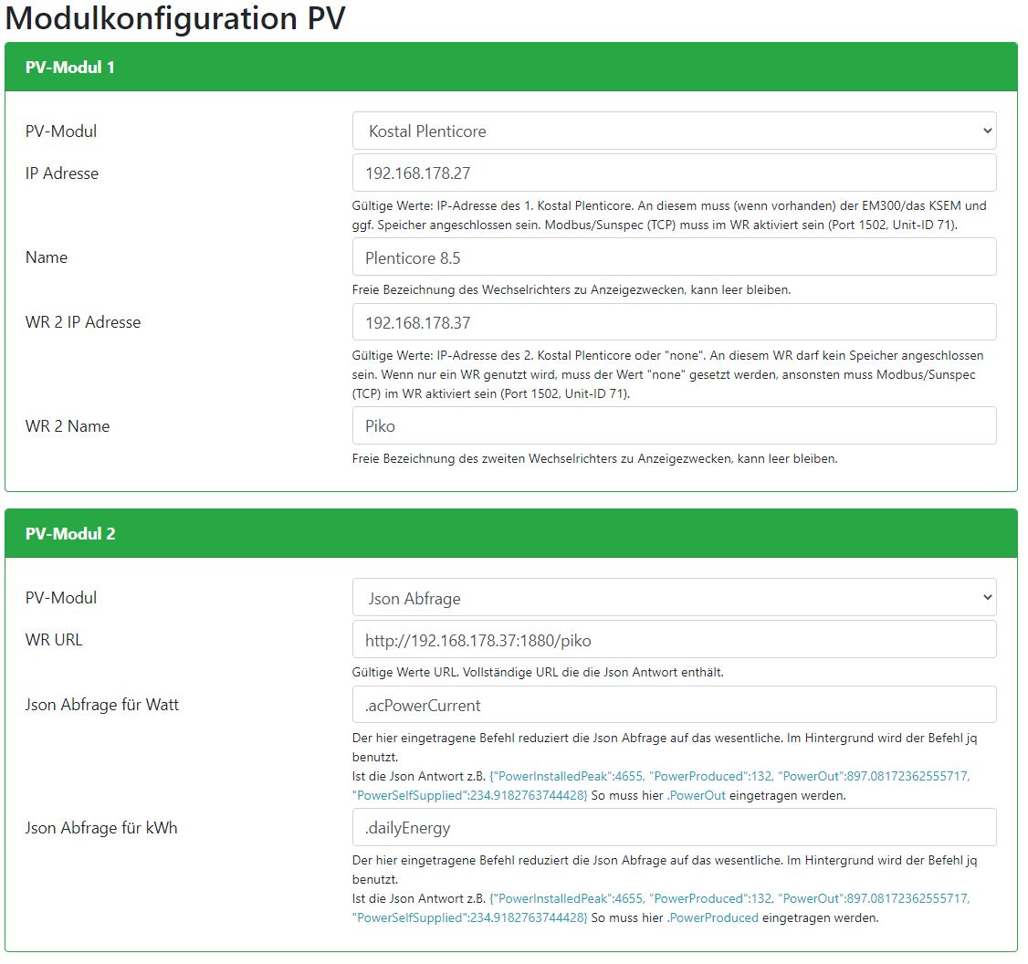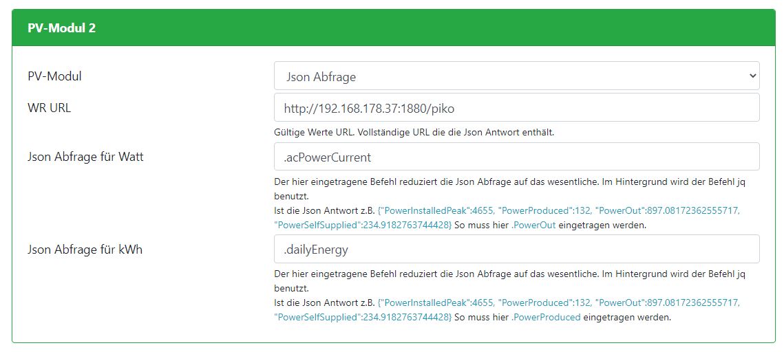 das N.-PV-Modul beschäftigt mich auch gerade, weil bei einem Freund mehrere Ausrichtungen über Modulwechselrichter und insgesamt (aktuell) 4 Sonoff POW laufen. Diese wiederum sollen dann auf Tasmota laufen. Somit kann man ja bis zu 2 über JSON in die 2 PV-Module eintragen.