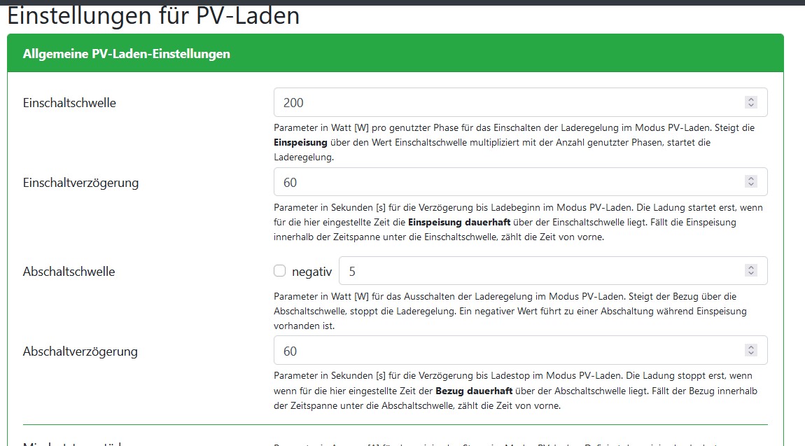 Welche Werte/Einstellungen soll ich dann konkret eintragen? Ausgehend von einer Mindestladeleistung von 8A/230V?openWB hat geschrieben: Sa Jan 15, 2022 9:57 am Das nurPV Laden mit entsprechenden Schwellen erfüllt das gewünschte Verhalten.