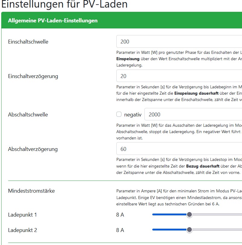 Die 100W-Überschuss sind recht krass eingestellt, das stimmt. Den Abstand könnte man größer machen, aber vom Prinzip her wäre es dann so, dass ich sobald Überschuss vorhanden, z.B. 100W, ich wirklich mit 1,8kW (8A) laden will, schlichtweg weil ich besser die 100W PV nutze als später gar keine PV mehr.