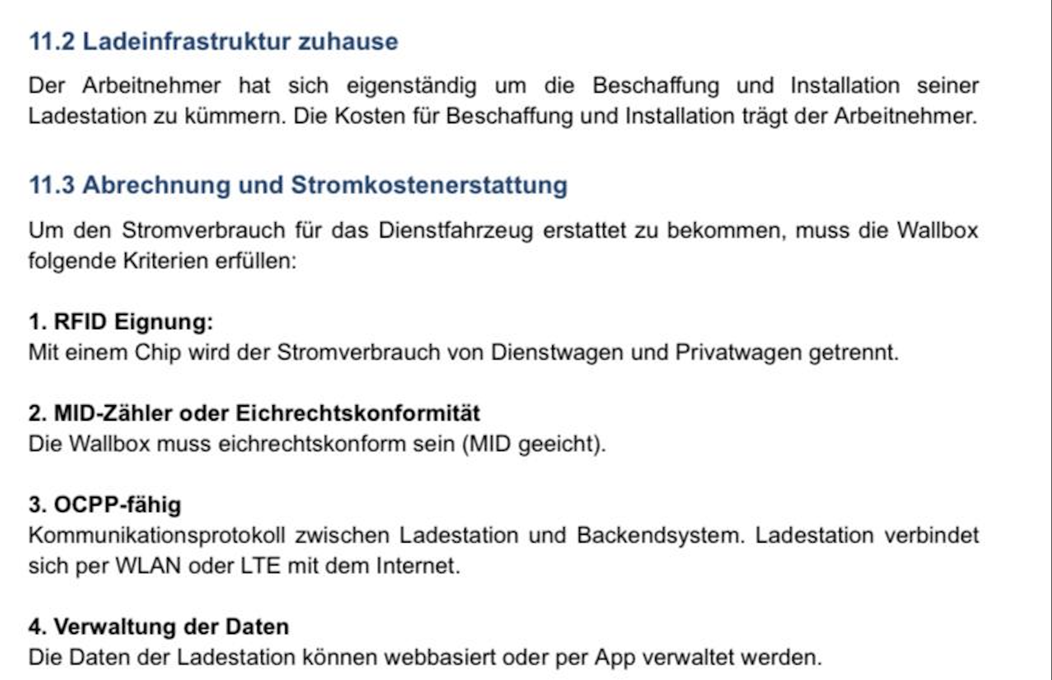 Der Arbeitgeber gibt hier folgende Anforderungen an das Laden zu Hause. Eine gemeinsame Nutzung einer WB für Firmenwagen und Privatwagen scheint bei uns möglich sein, da der Arbeitgeber das über RFID trennen möchte - richtig?