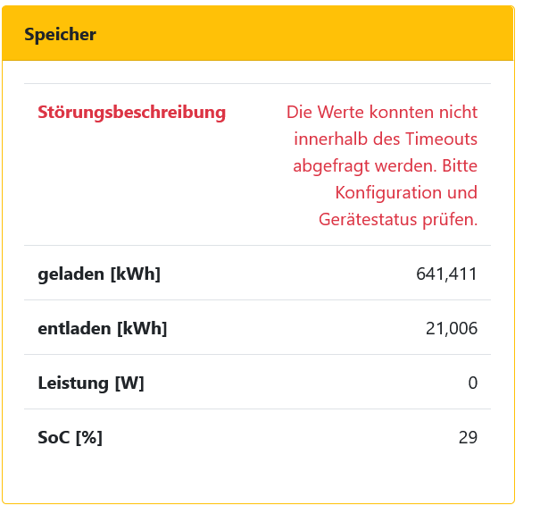 Kann ich unterstützen? In meiner Test- openWB funktioniert das BYD- Modul noch. Leistung ist eben zu Ende, deshalb 0 W. War eben aber noch sichtbar.yankee hat geschrieben: Mo Dez 20, 2021 2:27 pmKlar. Angesehen habe ich mir das Skript. Dass das so wie es ist nicht funktionieren kann ist ersichtlich. Aber wie es richtig ist weiß ich auch nicht. Habe keine BYD.Meth hat geschrieben: Mo Dez 20, 2021 12:34 pmKann sich der Verantwortliche das byd Batterie Modul mal ansehen?