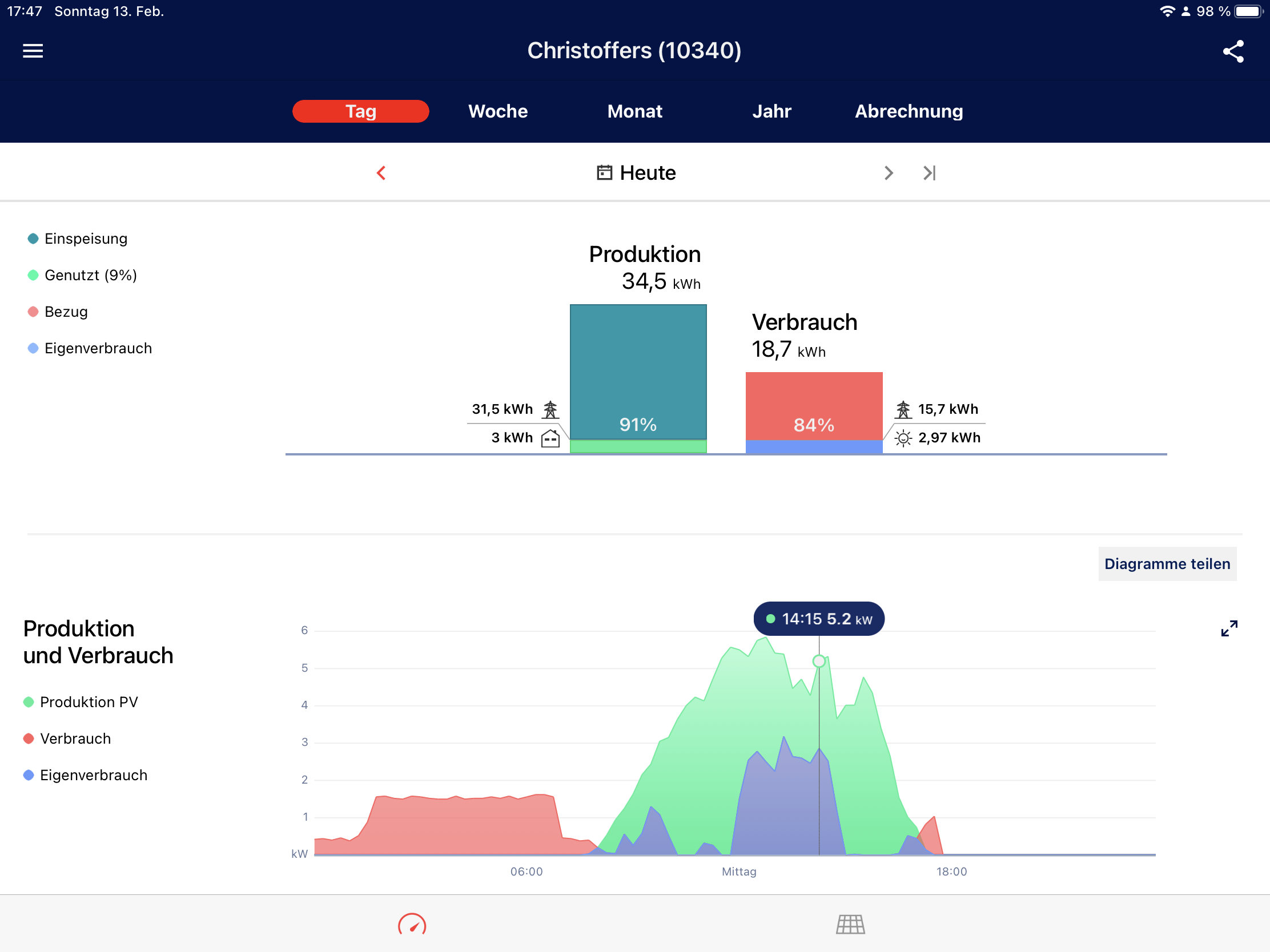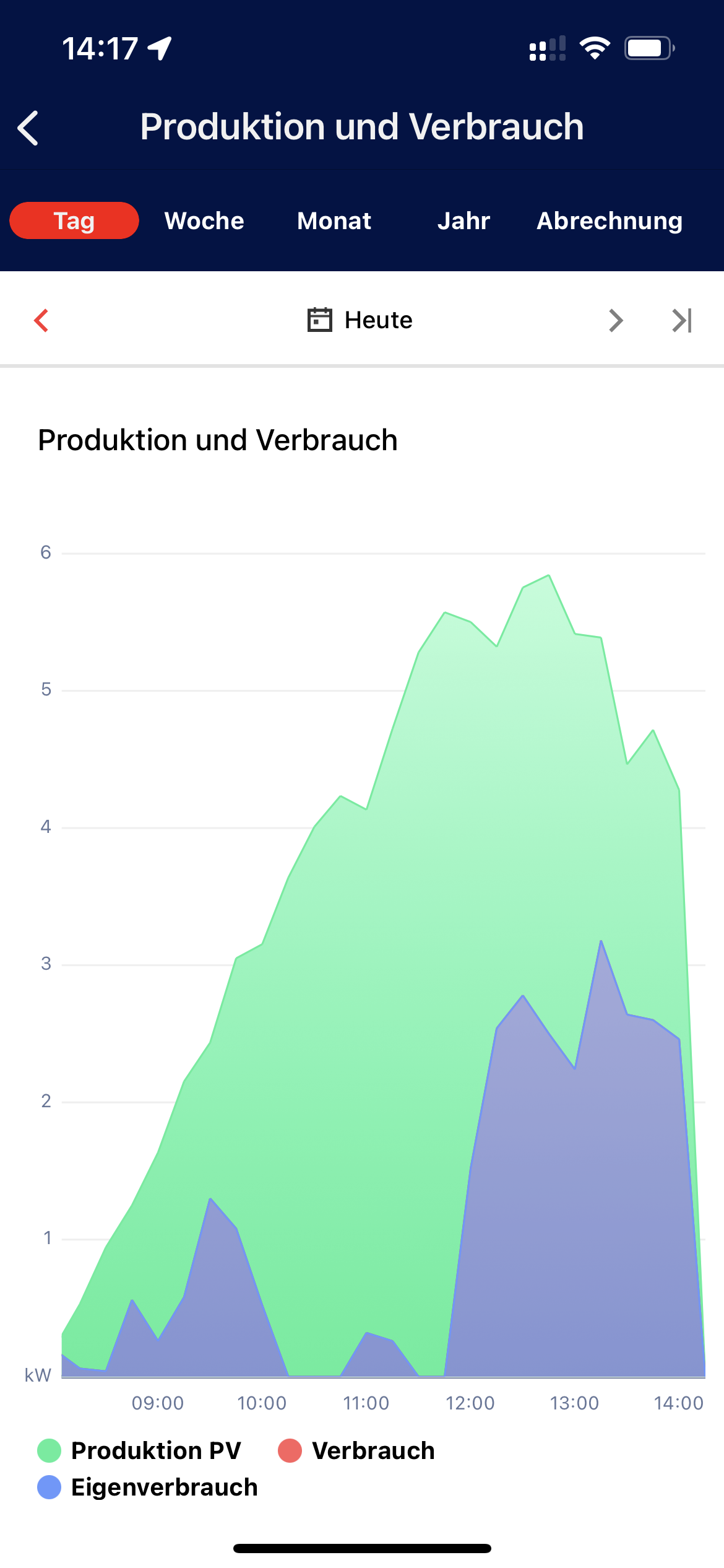 Anbei nochmal der Screenshot für heute. Ich hätte erwartet, das die Summe von Hausverbrauch, Heizung (ist im Hausverbrauch) & Autoladung, den Eigenverbrauch während des Autoladens Richtung 100% zieht.