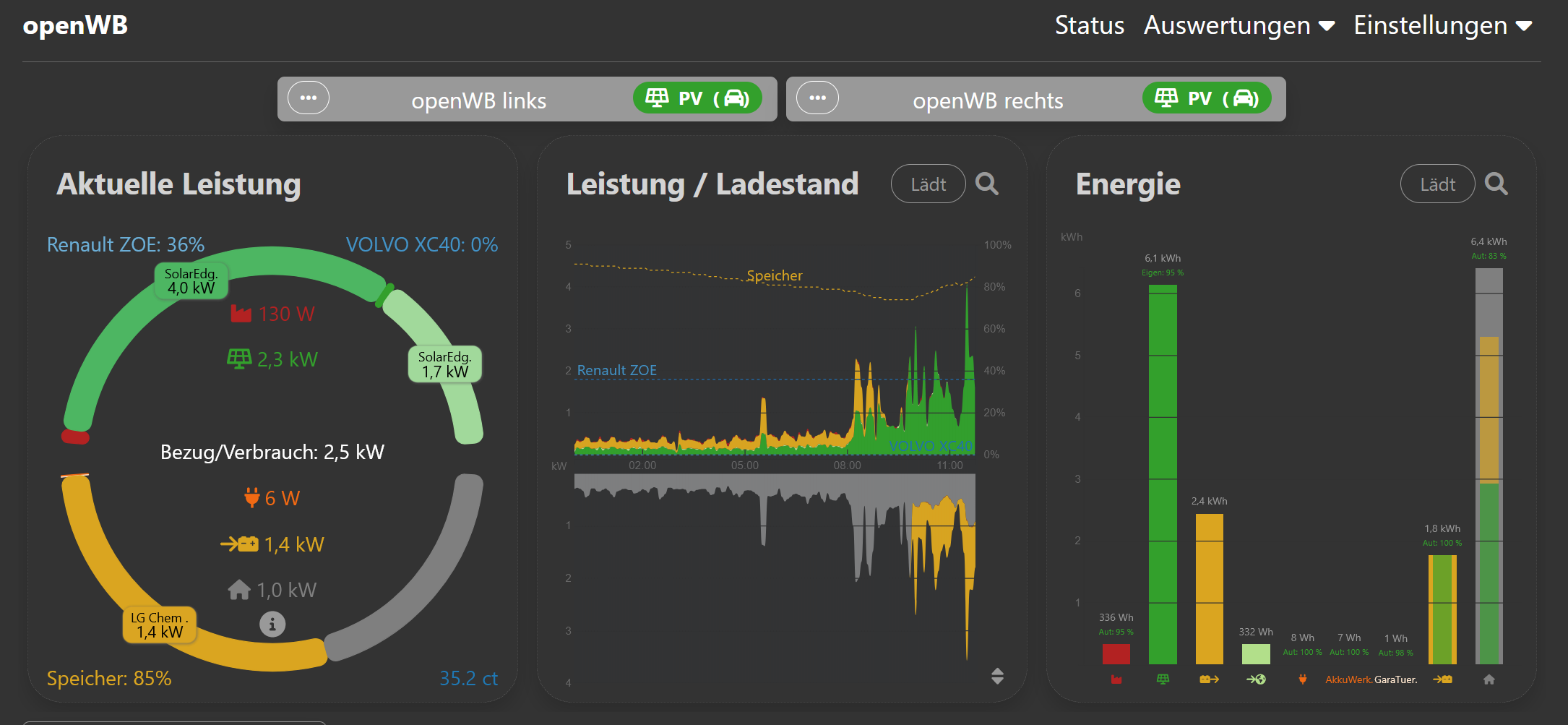 PV: 19.12 kWp, 1x SE10SEK + 13,8 SE Homebattery, 1x SE10SEK, 1x Hoymiles HMS-800W-2T, ACThor9s + 1x 3kW Heizstab, OpenWB Series 2 standard
