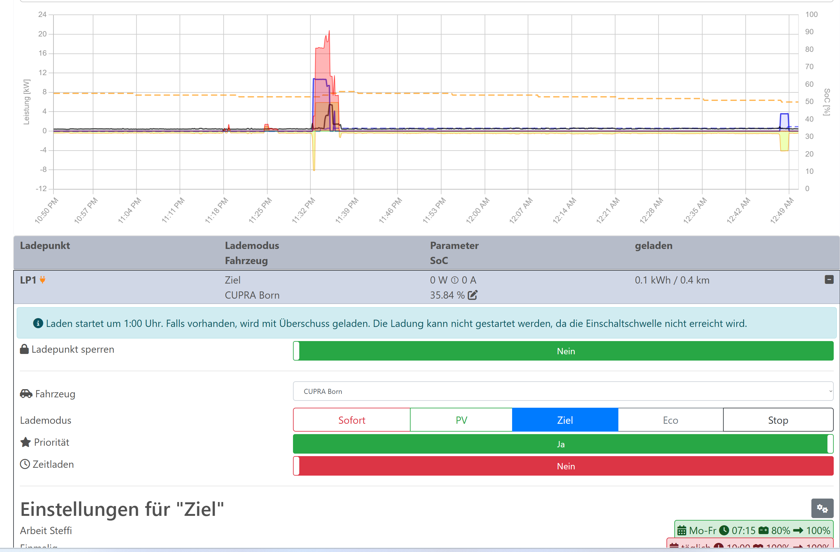 So, jetzt hat er ein paar Minuten eher als 0:53 mit 3,6 kW kurz geladen und will nun wieder 1:00 anfangen.