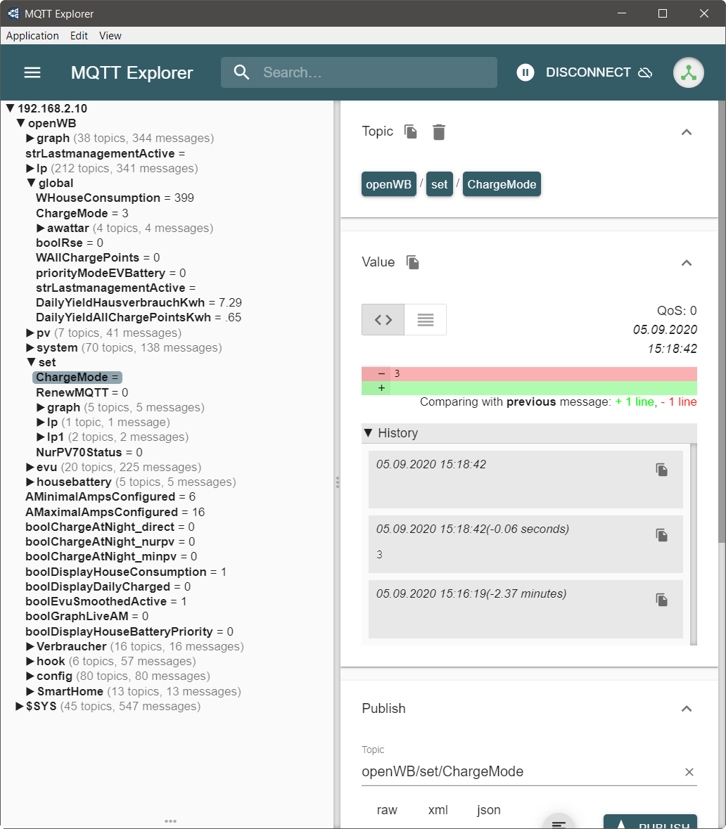 Ich hab jetzt die neuste 1.8.311Nightly (2020-09-05 13:01:08 +0200 [e51a5b8f] ) drauf. Der Wagen ist angesteckt und ich habe von STOP zu PV zu STOP gewechselt. Der Topic openWB/set/ChargeMode ist danach noch da, aber leer. Bin gespannt.