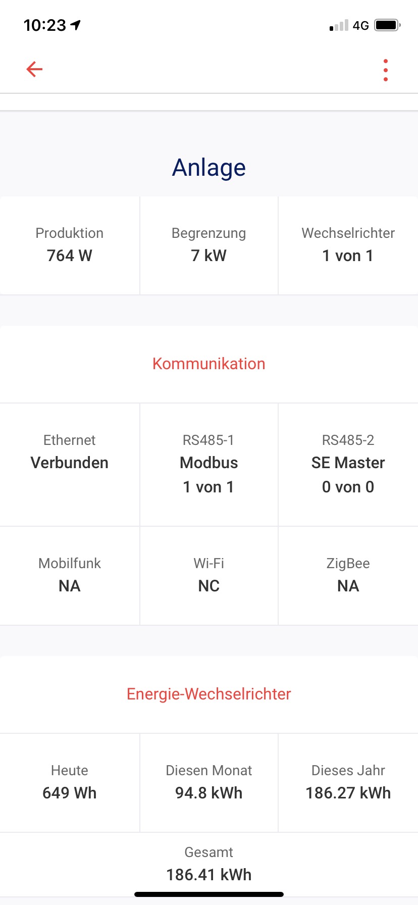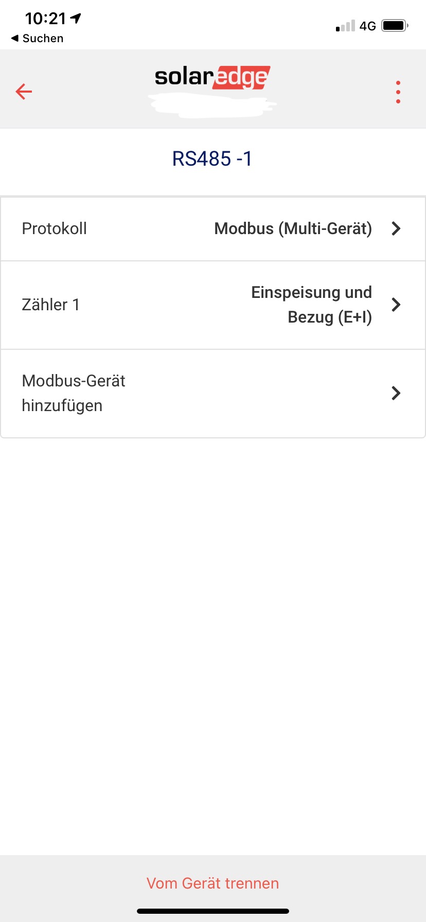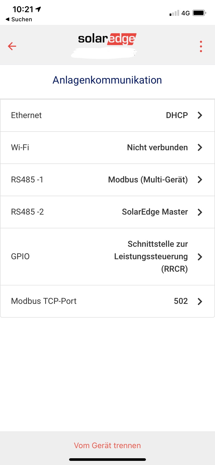 Dort geht ihr auf „Anlagenkommunikation“ und gelangt auf diese Seite. Dort seht ihr die beiden RS485 Ports. An meinem WR ist der RS485-1 mit dem SolarEdge Smartmeter/EVU Messpunkt verbunden (verdrahtet). Daher steht dort „Modbus (Multigerät)“. Der zweite Modbus Anschluss RS485-2 ist nicht physisch angeschlossen, hier muss der „SolarEdge Master“ eingestellt werden (das war mein Fehler, hatte hier vorher nichts...).