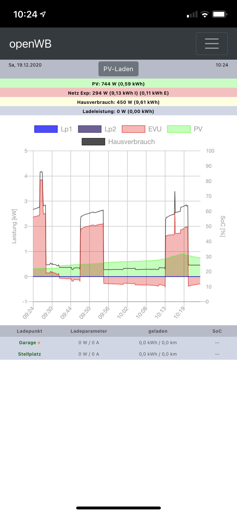 Ihr schaut euch auf der OpenWB den Graph an (welche Einstellungen zu wählen sind, siehe 5-10 Beiträge zuvor). Dort sollte es dann so aussehen. Wenn die Sonne nicht scheint, wird oben in der grünen PV-Zeile „PV: OW (x,xx kWh) angezeigt: