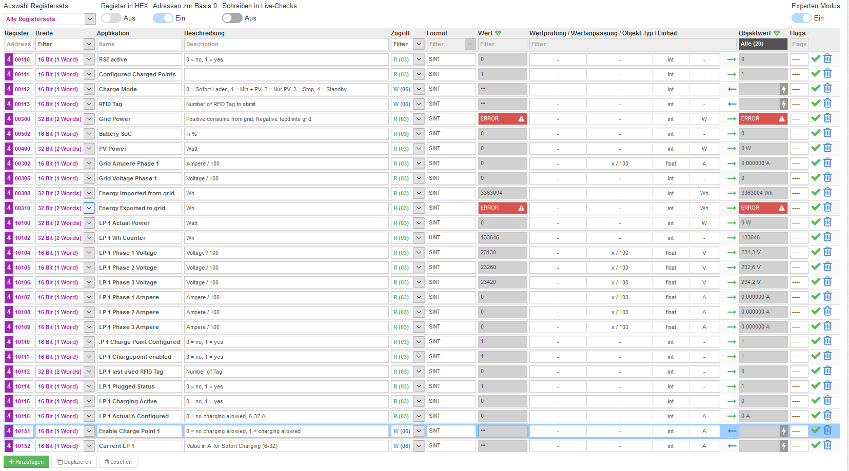 Nur bei den Registern 300 (Grid Leistung) und 310 (Energy Exported) bekomme ich immer Errormeldungen.
