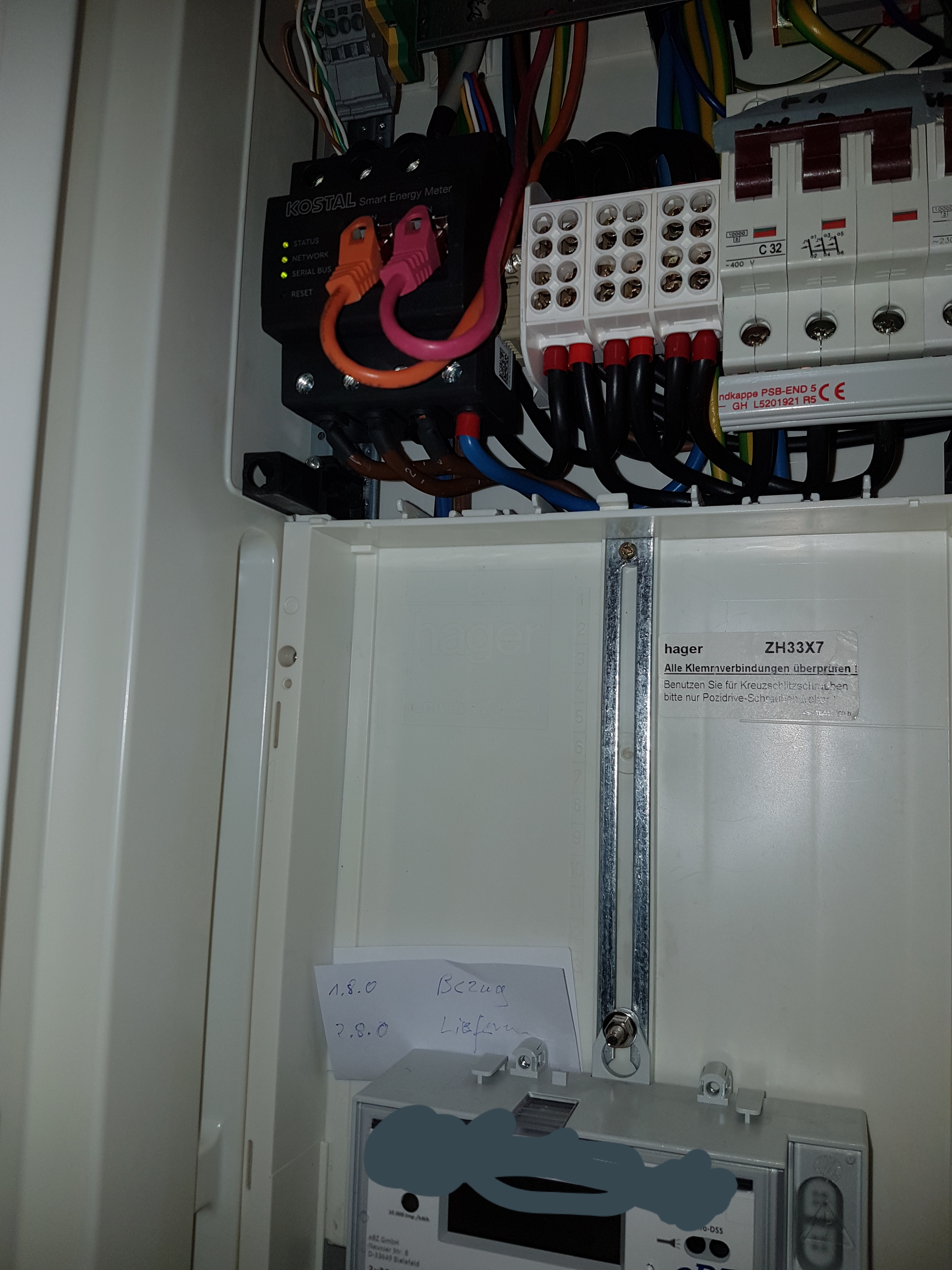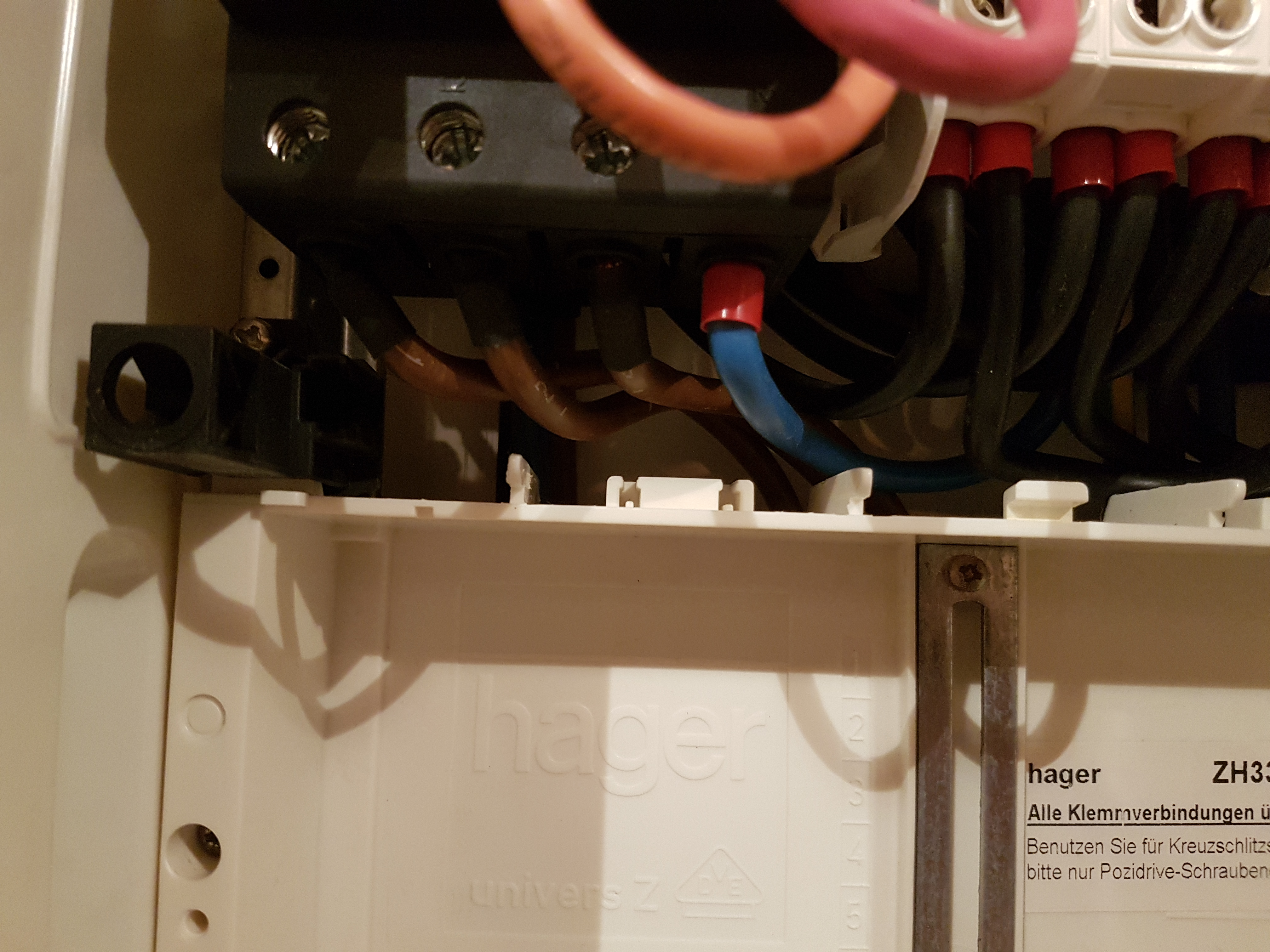 Da der EVU- Kit ganz rechts im Zählerschrank montiert ist, müssen die 3 braunen und die blaue Ader vom 2-R-Zähler natürlich über Klemmen verlängert sein bzw. ab sofort verlängert werden. Wichtig dabei ist, dass die blaue (N) auch am Anschlusspunkt abgegriffen wird, also vor irgendeinem FI! Sonst hast Du demnächst ein FI- Problem.