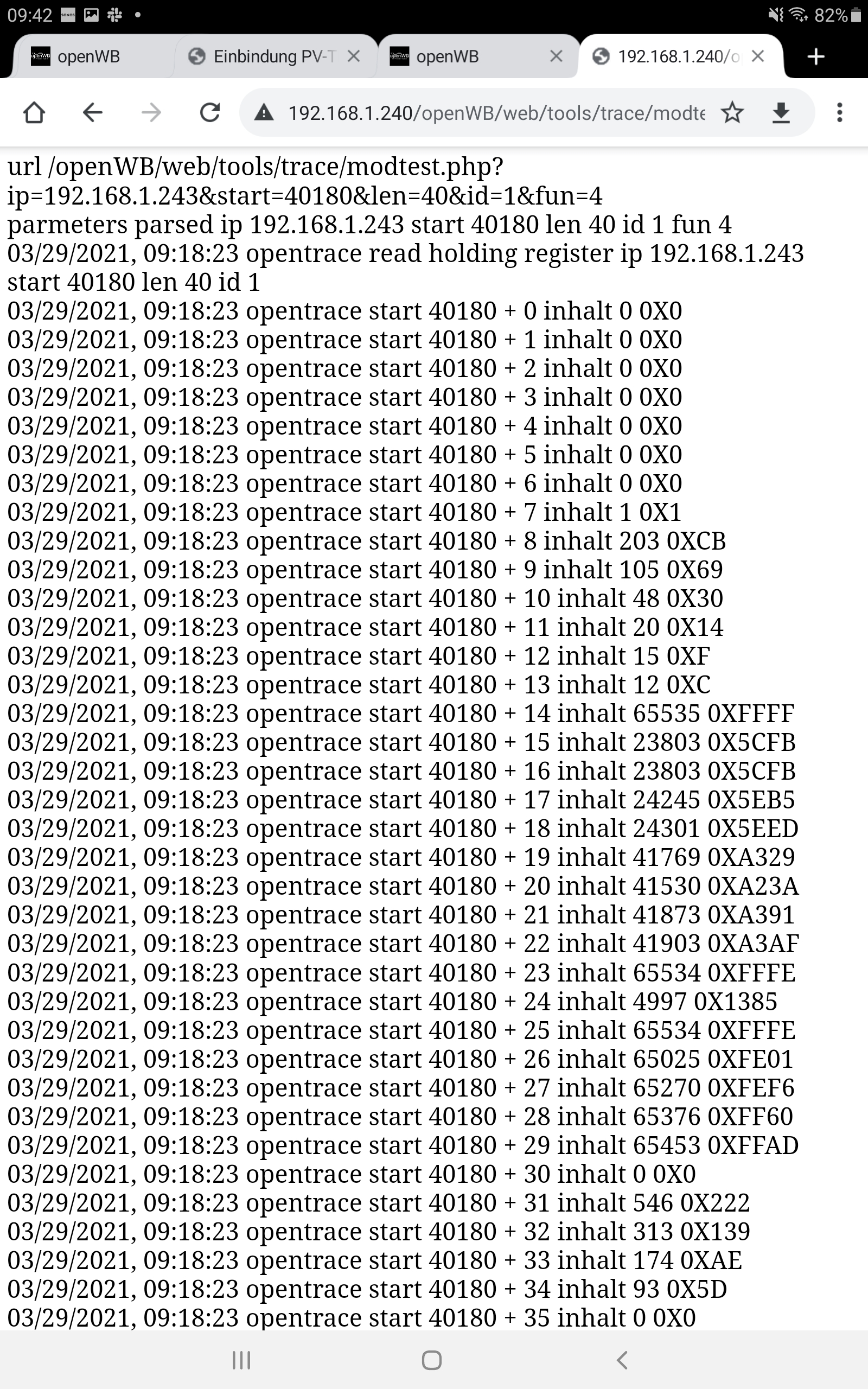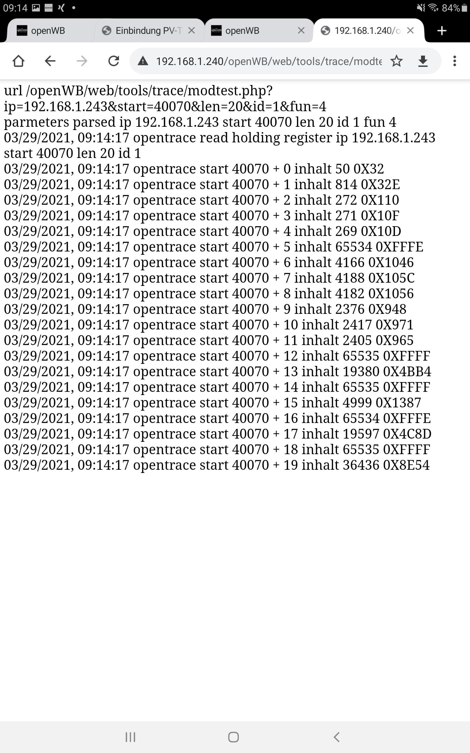 Hier noch ein paar Details:annuncio hat geschrieben: So Mär 28, 2021 11:28 am url /openWB/web/tools/trace/modtest.php?ip=192.168.10.222&start=40070&len=20&id=1&fun=4