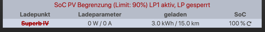Komisches Verhalten beim PV laden! Obwohl die EV-SoC-Ladung auf 0% steht und somit deaktiviert sein sollte bekomme ich folgende Meldung im PV-Lademodus und der Ladepunkt wird deaktiviert. Gleiches Verhalten war auch zu beobachten bei SoC 95%. Die EV-SoC-Ladung wurde zuvor mit 90% mal aktiviert lässt sich scheinbar aber nicht mehr deaktivieren bzw. die Änderung des Max SoC auf 100% scheint nicht mehr zu ziehen.