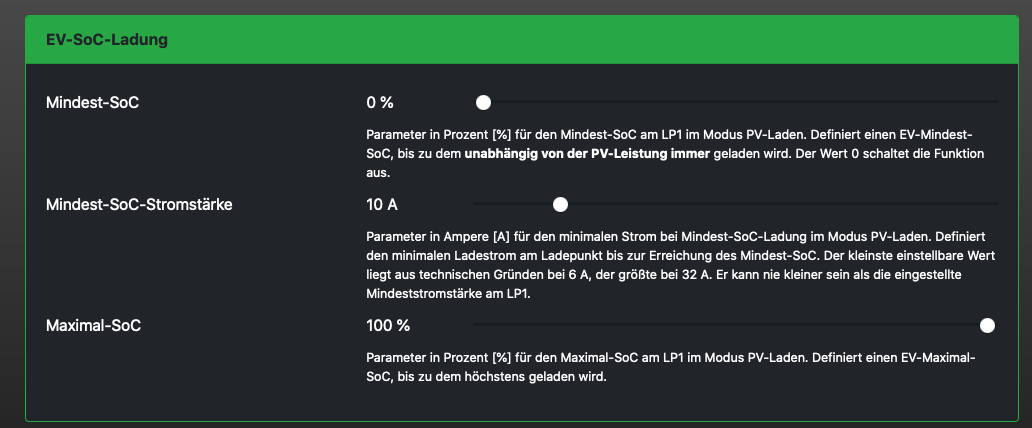 Hier die derzeitigen Einstellungen für EV-SoC-Ladung: