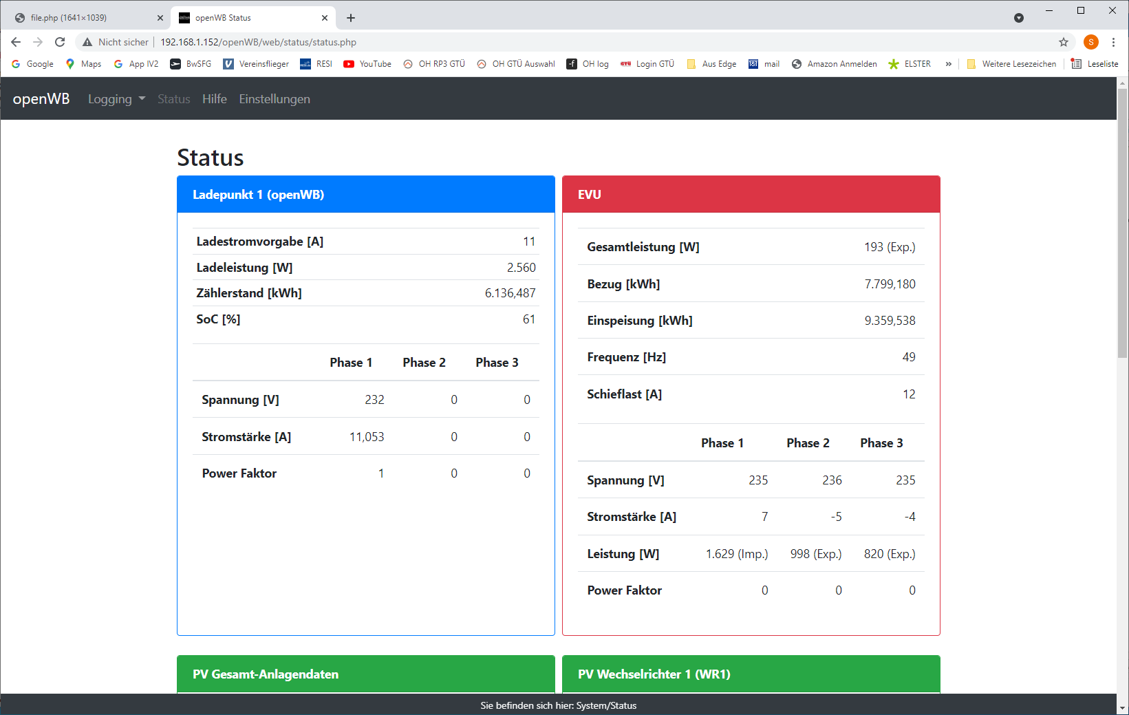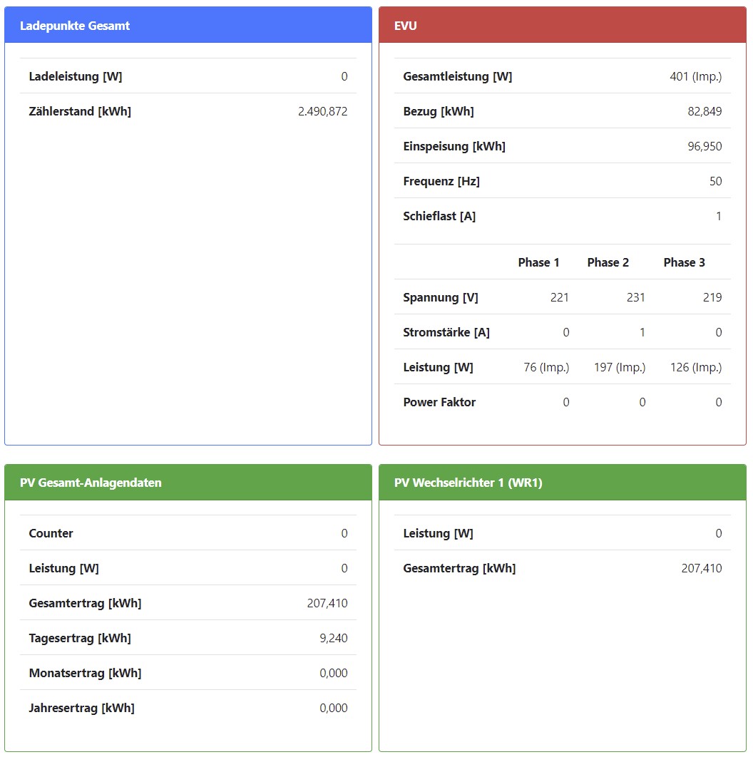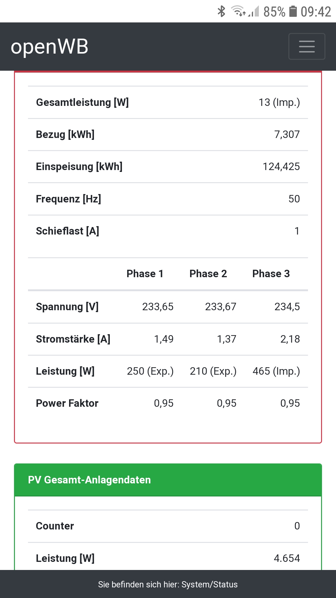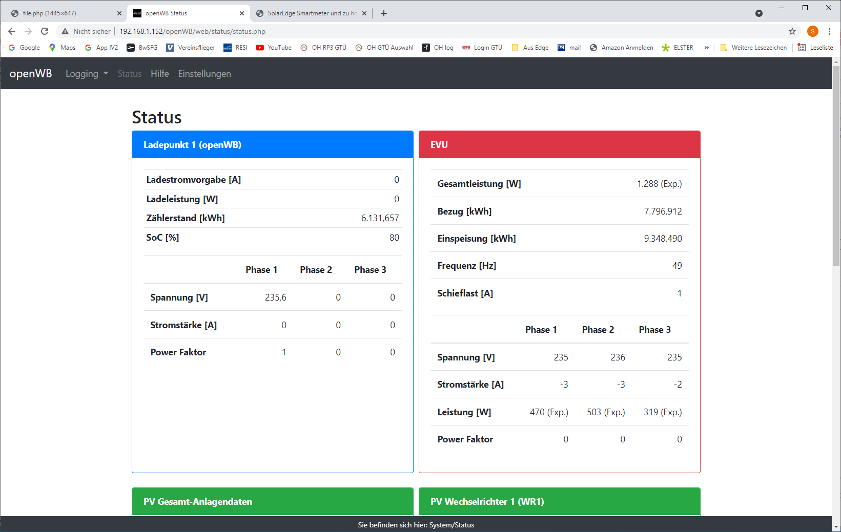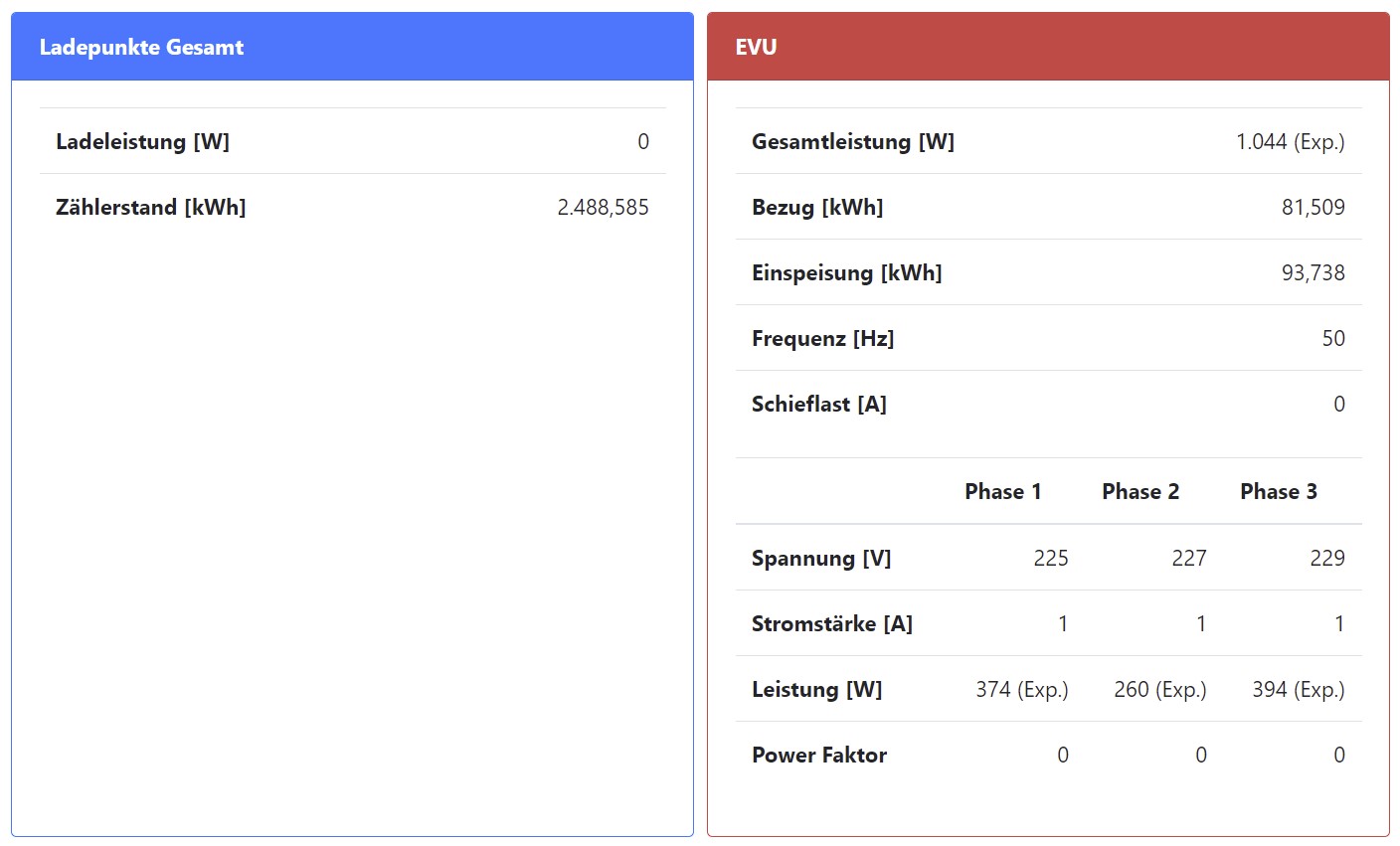 Anbei mein Status von jetzt. Import auf einer Phase, Export auf 2 Phasen. Ich lade nur einphasig, speise aber 3-phasig ein.