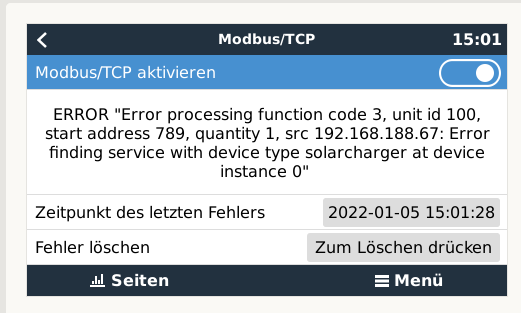 Es werde mir auch so weit ich das sehen kann Daten und Grafen in OpenWB angezeigt, nur wenn ich in der Venus drin schauen unter Dienste - Modbus/TCP bekomme ich ständig eine Fehlermeldung.