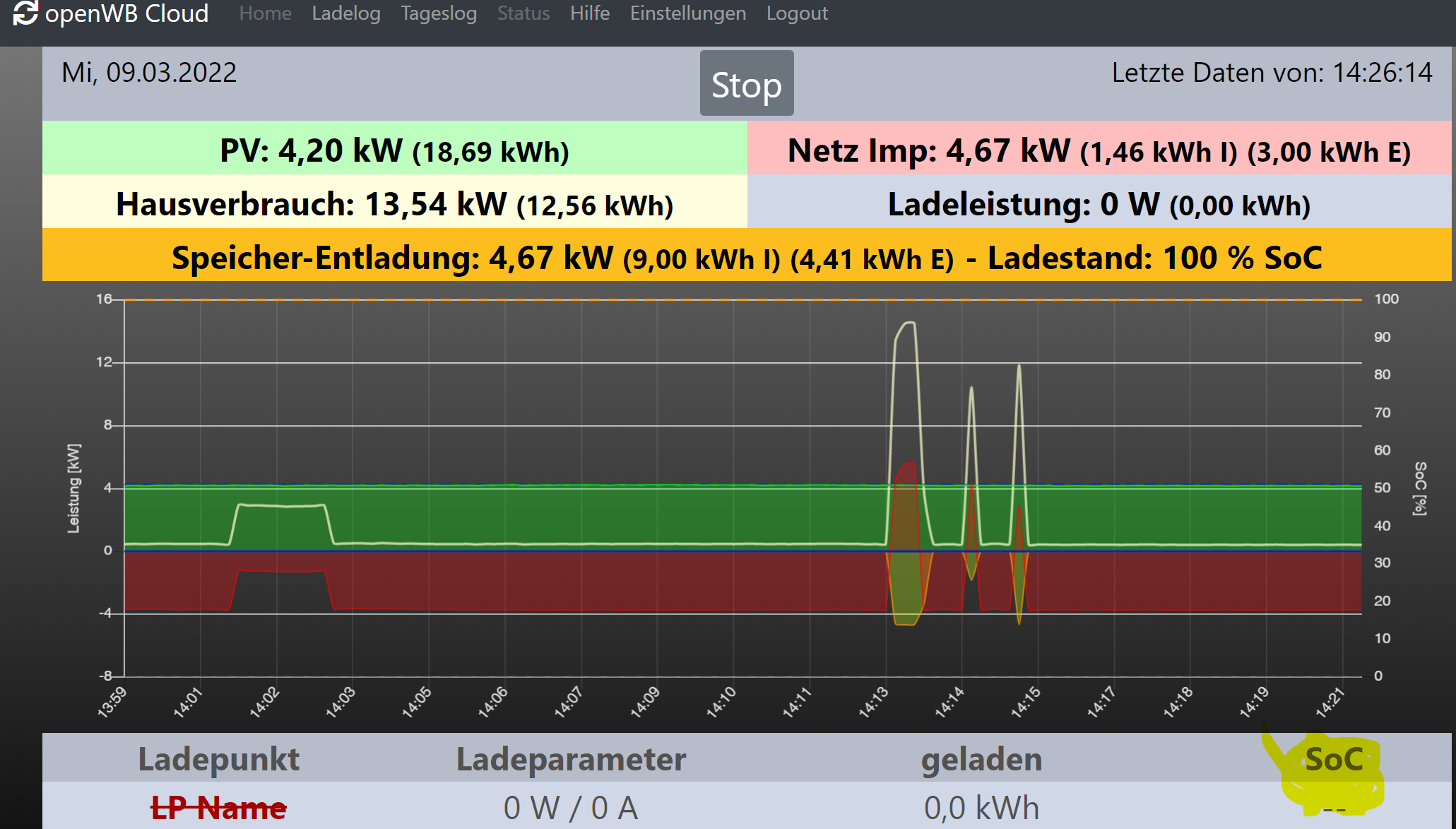 2022-03-04 14:44:57: PID: 1140: alle Ladepunkte, Lademodus NurPV. Ladung geändert auf 9 Ampere (LV0)