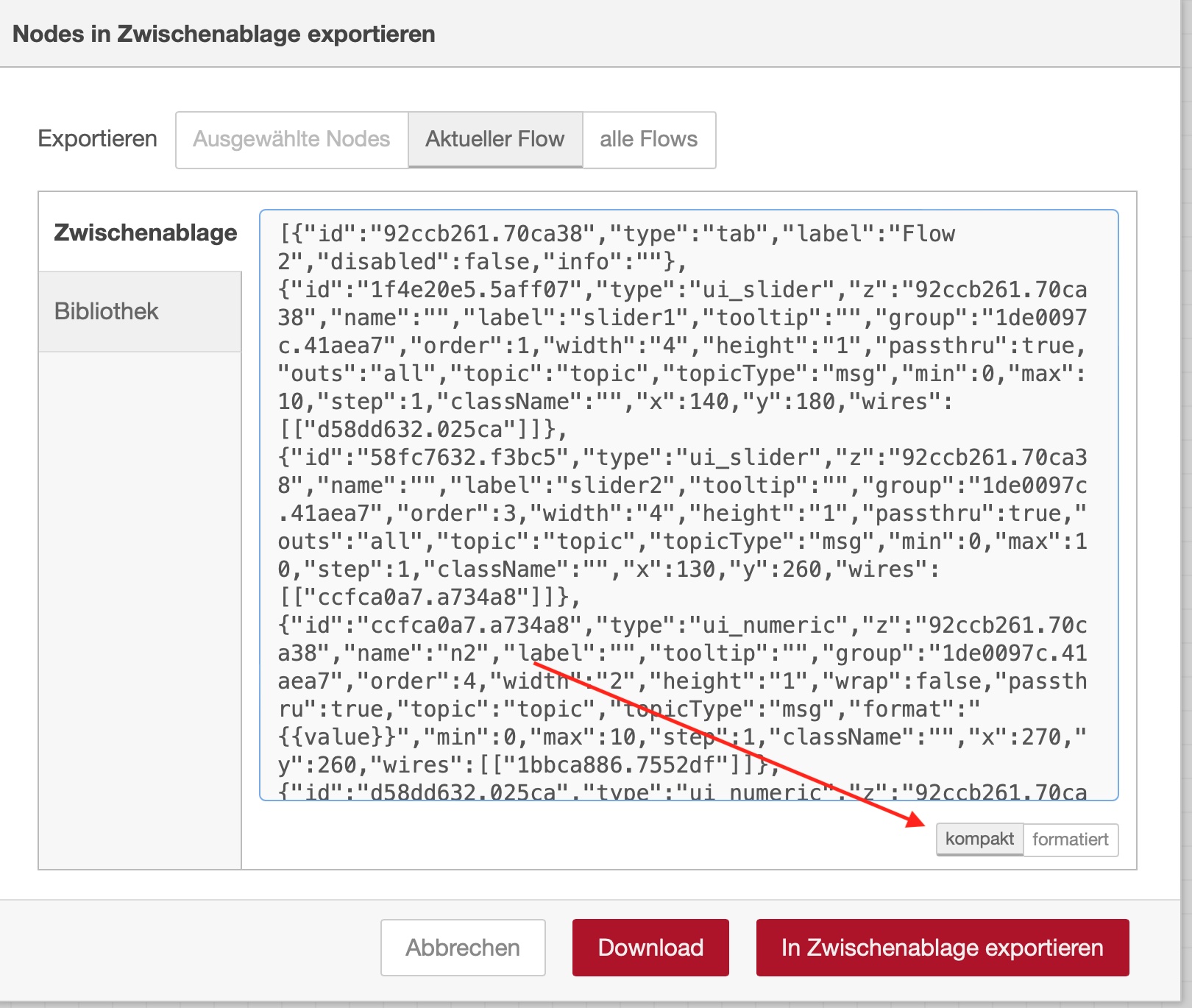 [{"id":"cf354afd.9bc818","type":"tab","label":"Gero","disabled":false,"info":""},{"id":"5719608c.cb6d5","type":"ui_slider","z":"cf354afd.9bc818","name":"","label":"HV1","tooltip":"","group":"e4b1e54c.678138","order":1,"width":"4","height":"1","passthru":true,"outs":"all","topic":"topic","topicType":"msg","min":0,"max":"20","step":1,"className":"","x":270,"y":100,"wires":[["bbecace6.cf6118"]]},{"id":"4c4decd7.181c64","type":"ui_slider","z":"cf354afd.9bc818","name":"","label":"HV2","tooltip":"","group":"e4b1e54c.678138","order":3,"width":"4","height":"1","passthru":true,"outs":"all","topic":"topic","topicType":"msg","min":0,"max":"20","step":1,"className":"","x":270,"y":180,"wires":[["73c7b491.eca484"]]},{"id":"73c7b491.eca484","type":"ui_numeric","z":"cf354afd.9bc818","name":"n2","label":"","tooltip":"","group":"e4b1e54c.678138","order":4,"width":"2","height":"1","wrap":false,"passthru":true,"topic":"topic","topicType":"msg","format":"{{value}}","min":0,"max":"20","step":1,"className":"","x":410,"y":180,"wires":[["90ab8442.f81ce","4c4decd7.181c64"]]},{"id":"bbecace6.cf6118","type":"ui_numeric","z":"cf354afd.9bc818","name":"n1","label":"","tooltip":"","group":"e4b1e54c.678138","order":2,"width":"2","height":"1","wrap":false,"passthru":true,"topic":"topic","topicType":"msg","format":"{{value}}","min":0,"max":"20","step":1,"className":"","x":410,"y":100,"wires":[["c0e5a2f6.6011a8","5719608c.cb6d5"]]},{"id":"c0e5a2f6.6011a8","type":"change","z":"cf354afd.9bc818","name":"","rules":[{"t":"set","p":"s1","pt":"flow","to":"payload","tot":"msg"}],"action":"","property":"","from":"","to":"","reg":false,"x":610,"y":100,"wires":[["532109e9.94e058"]]},{"id":"90ab8442.f81ce","type":"change","z":"cf354afd.9bc818","name":"","rules":[{"t":"set","p":"s2","pt":"flow","to":"payload","tot":"msg"}],"action":"","property":"","from":"","to":"","reg":false,"x":610,"y":180,"wires":[["532109e9.94e058"]]},{"id":"532109e9.94e058","type":"function","z":"cf354afd.9bc818","name":"Summe in Watt","func":"msg.payload = flow.get(\"s1\")+flow.get(\"s2\")+flow.get(\"s3\");\nmsg.payload = 230*msg.payload;\nreturn msg;","outputs":1,"noerr":0,"initialize":"","finalize":"","x":820,"y":180,"wires":[["73d4ae7a.9e5378","9e6ce960.f2e4a8"]]},{"id":"73d4ae7a.9e5378","type":"ui_gauge","z":"cf354afd.9bc818","name":"","group":"e4b1e54c.678138","order":7,"width":0,"height":0,"gtype":"gage","title":"total","label":"Watt","format":"{{value}}","min":0,"max":"13800","colors":["#00b500","#e6e600","#ca3838"],"seg1":"","seg2":"","className":"","x":1030,"y":180,"wires":[]},{"id":"9f19e960.3fd5e8","type":"mqtt in","z":"cf354afd.9bc818","name":"Hausverbrauch","topic":"openWB/global/WHouseConsumption","qos":"2","datatype":"auto","broker":"978968c8.7b5238","x":300,"y":380,"wires":[[]]},{"id":"33e16f4f.c097e8","type":"ui_slider","z":"cf354afd.9bc818","name":"","label":"HV3","tooltip":"","group":"e4b1e54c.678138","order":5,"width":"4","height":"1","passthru":true,"outs":"all","topic":"topic","topicType":"msg","min":0,"max":"20","step":1,"className":"","x":270,"y":260,"wires":[["c46e3ffe.11dc18"]]},{"id":"c46e3ffe.11dc18","type":"ui_numeric","z":"cf354afd.9bc818","name":"n3","label":"","tooltip":"","group":"e4b1e54c.678138","order":6,"width":"2","height":"1","wrap":false,"passthru":true,"topic":"topic","topicType":"msg","format":"{{value}}","min":0,"max":"20","step":1,"className":"","x":410,"y":260,"wires":[["db7c49ee.fd03e8","33e16f4f.c097e8"]]},{"id":"db7c49ee.fd03e8","type":"change","z":"cf354afd.9bc818","name":"","rules":[{"t":"set","p":"s3","pt":"flow","to":"payload","tot":"msg"}],"action":"","property":"","from":"","to":"","reg":false,"x":610,"y":260,"wires":[["532109e9.94e058"]]},{"id":"9e6ce960.f2e4a8","type":"debug","z":"cf354afd.9bc818","name":"","active":true,"tosidebar":true,"console":false,"tostatus":false,"complete":"false","statusVal":"","statusType":"auto","x":1020,"y":260,"wires":[]},{"id":"3b68517d.870aae","type":"inject","z":"cf354afd.9bc818","name":"","props":[{"p":"payload"}],"repeat":"","crontab":"","once":true,"onceDelay":0.1,"topic":"","payload":"0","payloadType":"num","x":70,"y":180,"wires":[["5719608c.cb6d5","4c4decd7.181c64","33e16f4f.c097e8"]]},{"id":"e4b1e54c.678138","type":"ui_group","name":"Sim Hausverbrauch","tab":"744b5117.d18b28","order":1,"disp":true,"width":"6","collapse":false,"className":""},{"id":"978968c8.7b5238","type":"mqtt-broker","name":"OpenWB","broker":"192.168.8.11","port":"1883","clientid":"","usetls":false,"compatmode":false,"keepalive":"30","cleansession":true,"birthTopic":"","birthQos":"0","birthRetain":"false","birthPayload":"","closeTopic":"","closeQos":"0","closeRetain":"false","closePayload":"","willTopic":"","willQos":"0","willRetain":"false","willPayload":""},{"id":"744b5117.d18b28","type":"ui_tab","name":"Haussimulation","icon":"dashboard","disabled":false,"hidden":false}]Wenn ich das hier: