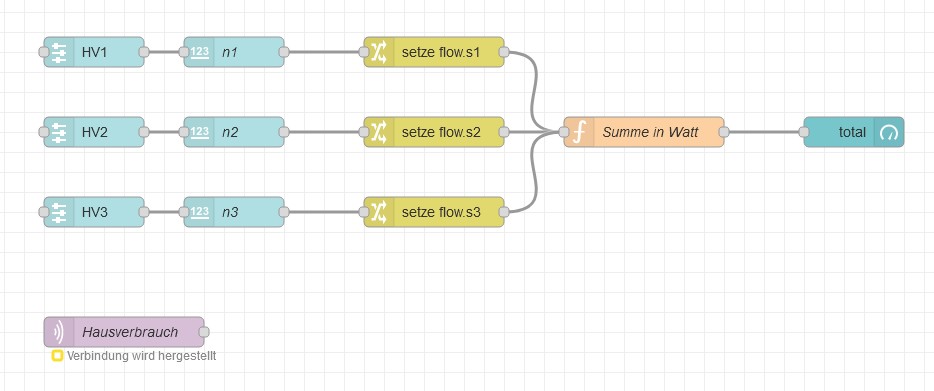 Ich will dort die 3 Werte addieren und x 230V rechen, um den Hausverbrauch in Watt auszugeben (und auf den Gauge-node zu senden).