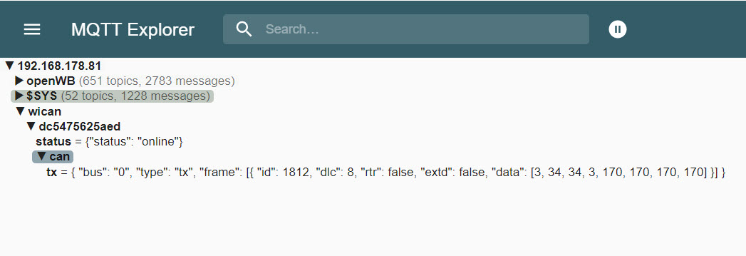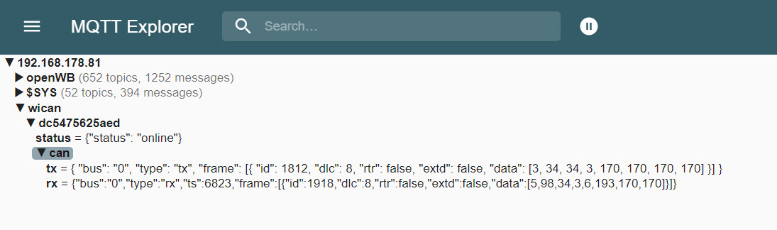 2023-11-13 17:27:34.576667 Empfangene CAN-Botschaft: b'{"bus":"0","type":"rx","ts":16839,"frame":[{"id":1918,"dlc":8,"rtr":false,"extd":false,"data":[5,98,34,3,2,238,170,170]}]}'