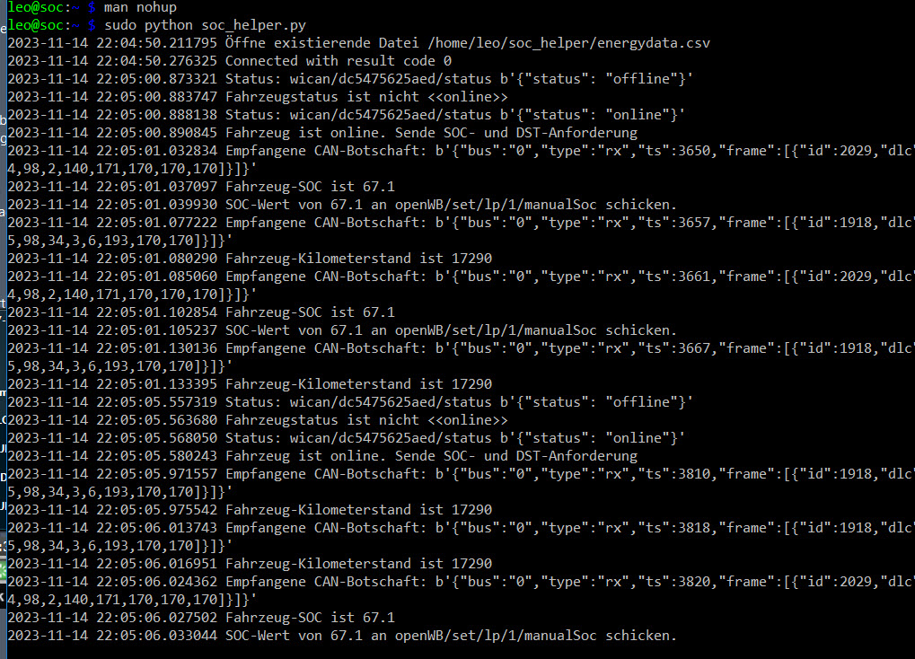 2023-11-13 17:27:34.515641 Fahrzeug ist online. Sende SOC- und DST-Anforderung