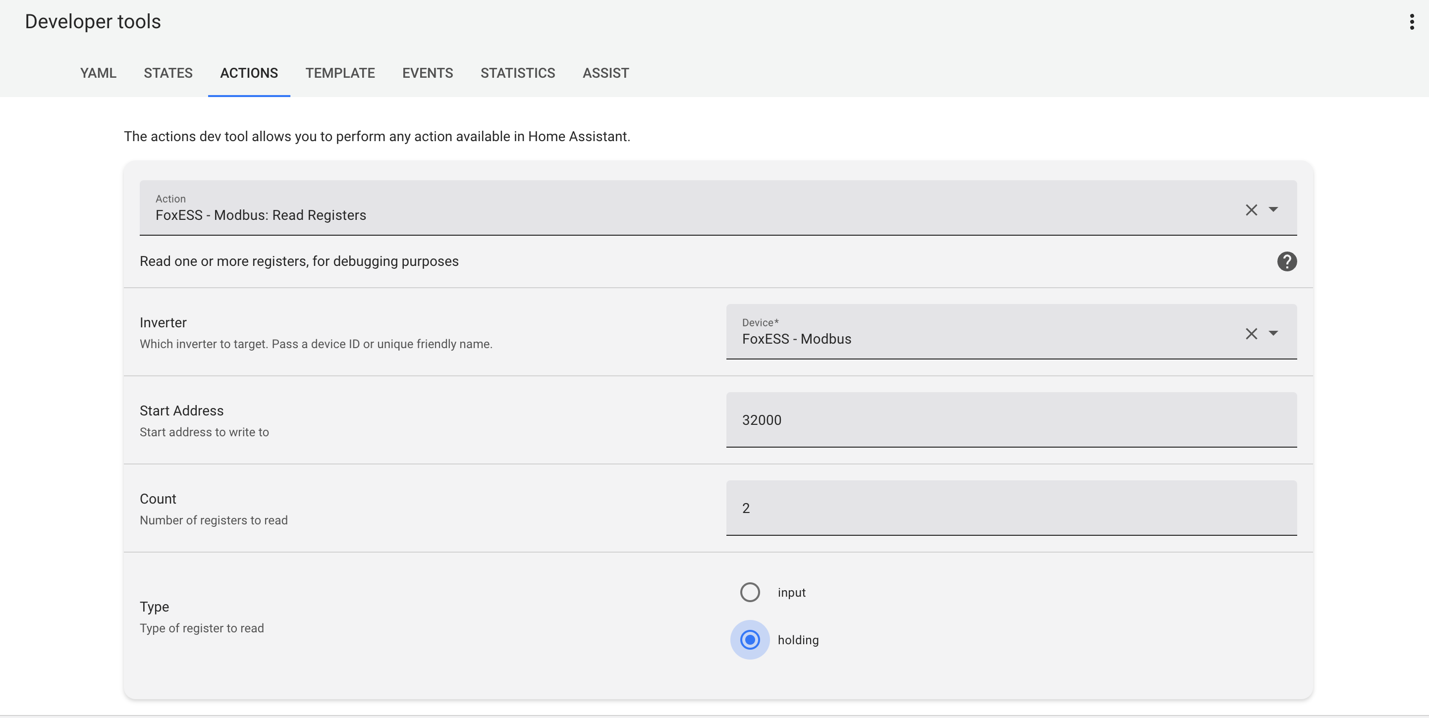 Gehe in die HA developer tools und versuche das Register zu lesen:
