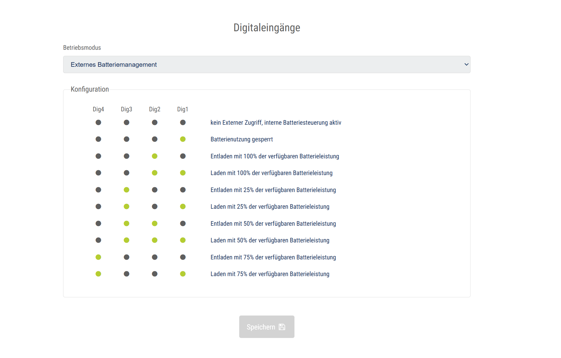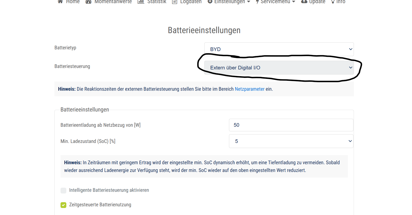 das ist die Einstellung Das musst du einschalten das er Externe Signale über die Digital i/o annimmt . Und hier ist beschrieben wie die geschalten werden müssen (bei mir über nen Shelly Pro ) VCC vom wechselrichter zum shelly und dann entsprechend durchschalten . Wichtig müssen Trockene Kontakte sein !!!
