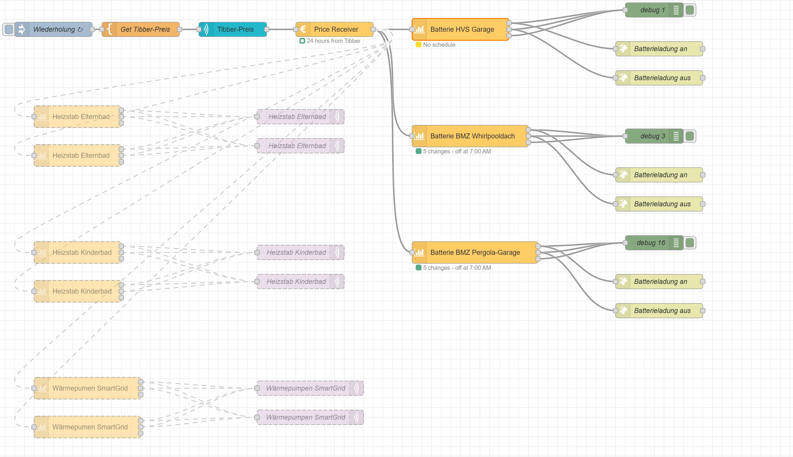 Hier noch ein Bild von meinem Node Red Flow Die Heizstäbe und die Wärmepumpe mach ich später noch aktiv sobald die oWb externe Mqtt befehle zulässt im SmartHome bereich