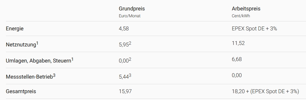 Hier mal die aktuellen Awattar-Preise aus meiner Region (Annahme Jahresverbrauch 10.000kWh). Selbst wenn die Netzentgelte in Deiner Region abweichen passt das trotzdem überhaupt nicht mit Deiner Dezember-Rechnung überein. Es sei denn ich habe irgendwo einen dicken Denkfehler. Oder Du hast einen komplett anderen Vertrag mit einen völlig anderen Preismodell