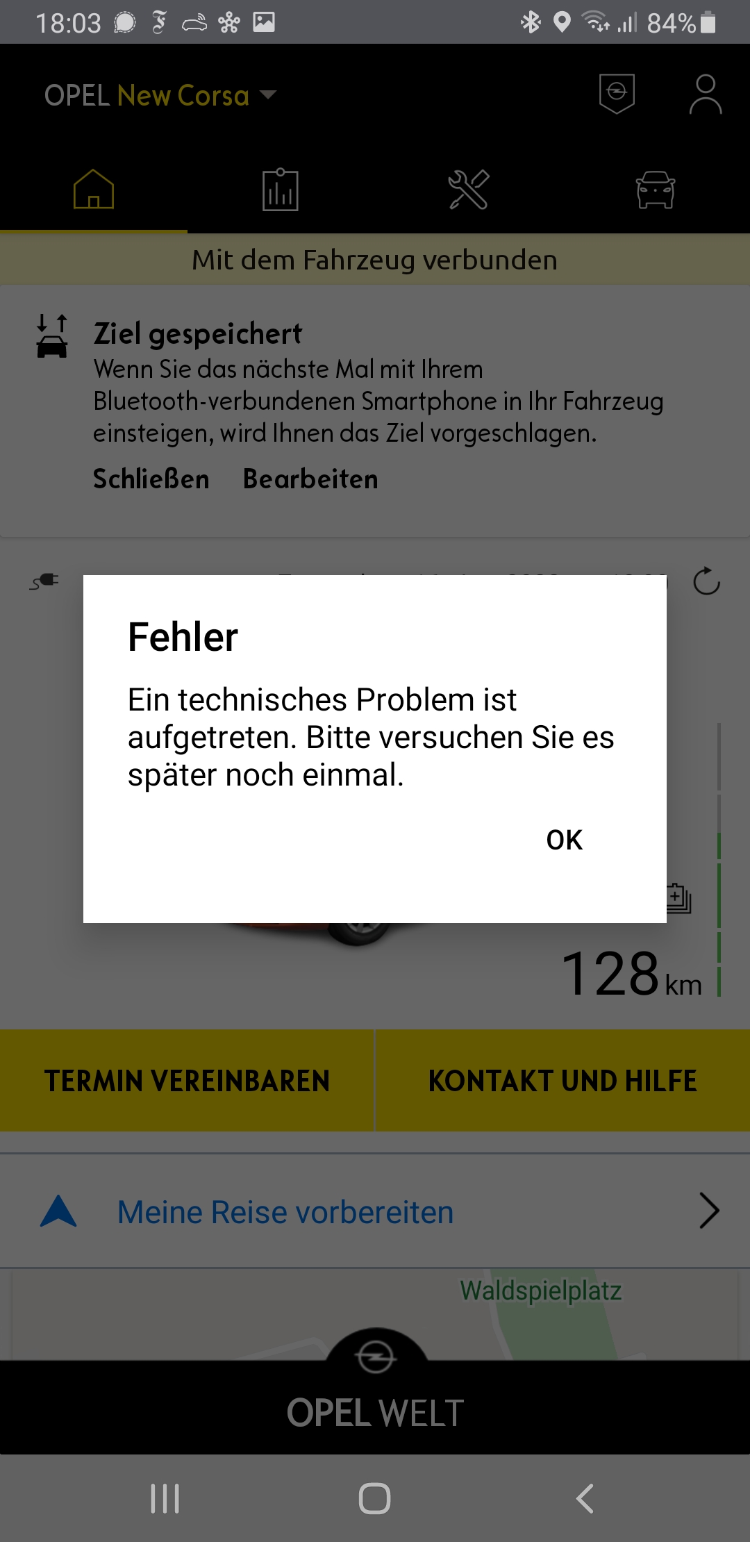 Allerdings zeigt bei mir auch die myOpel-App seit 12.01.2022 keinen SoC-Wert mehr sondern nur die Reichweite in km und eine Fehlermeldung (siehe Screenshot).