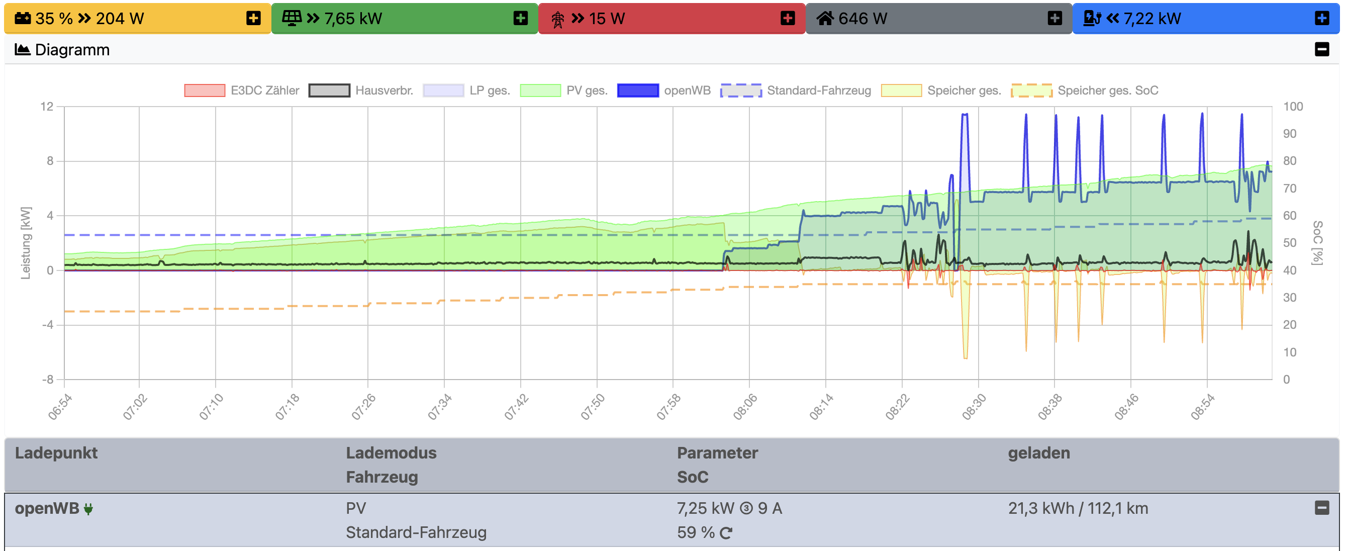 Hier ein Ladestart bei vollem Sonnenschein und vielen laufenden smarthome-geräten. Alle definiert als „abschaltbar“ um Autoladen die Priorität zu geben: