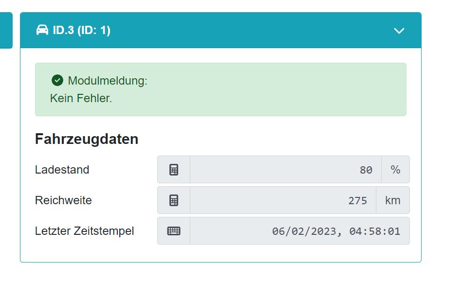 2023-06-02 19:26:43,065 - {modules.vehicles.vwid.soc:36} - {ERROR:soc_ev2} - Result not stored: soc=0, range=0.0Edit: Kaum geschrieben geht es. Vielleicht hat der VW Server Schluckauf?