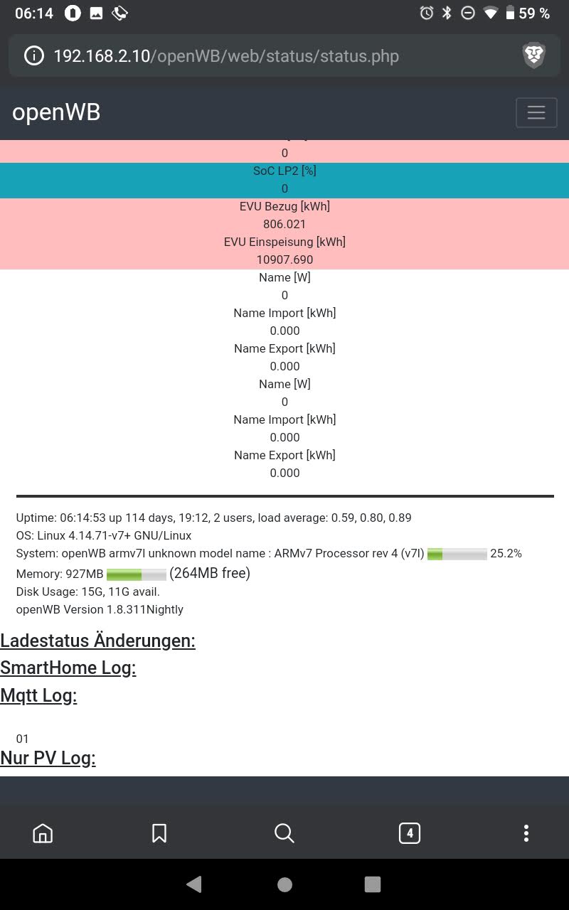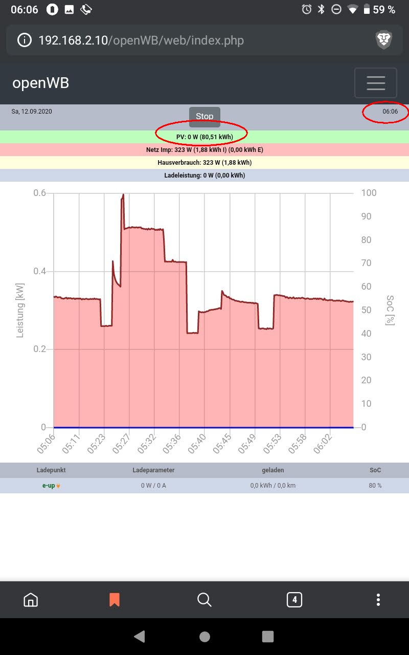 1.) Ja. Einstellung nach boot ist PV-Laden.LutzB hat geschrieben: Sa Sep 12, 2020 8:16 am Ist der Lademodus nach Start der openWB (in den Einstellungen unter Verschiedenes) auch auf PV gesetzt? Was sagt Deine Uptime im Status? Gab es zu der Zeit diese Nacht vielleicht eine Trennung der Internetleitung?