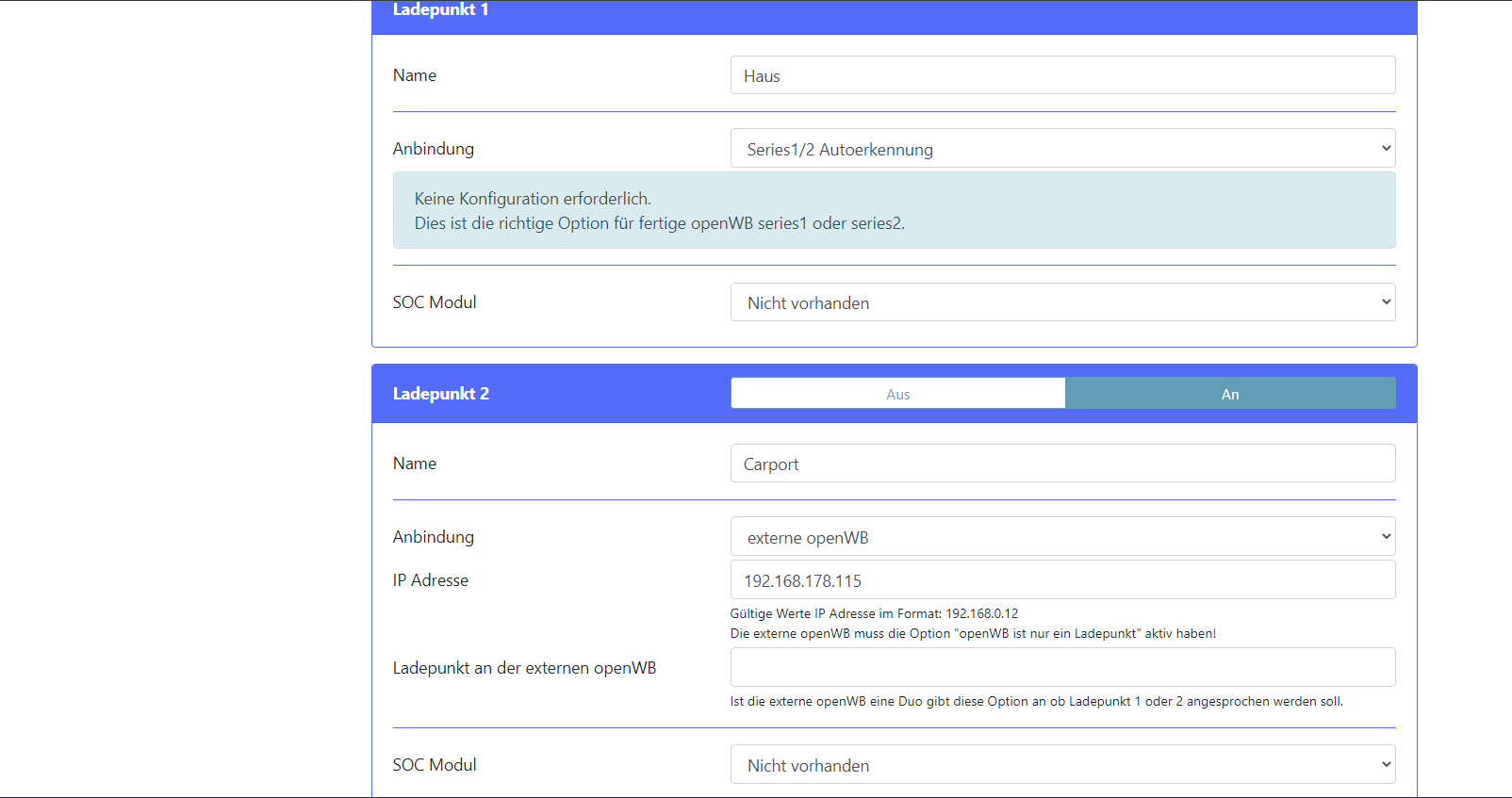 Beide Ladepunkte müssen als externe OpenWB mit den IP‘s aus der Fritte gesetzt sein.