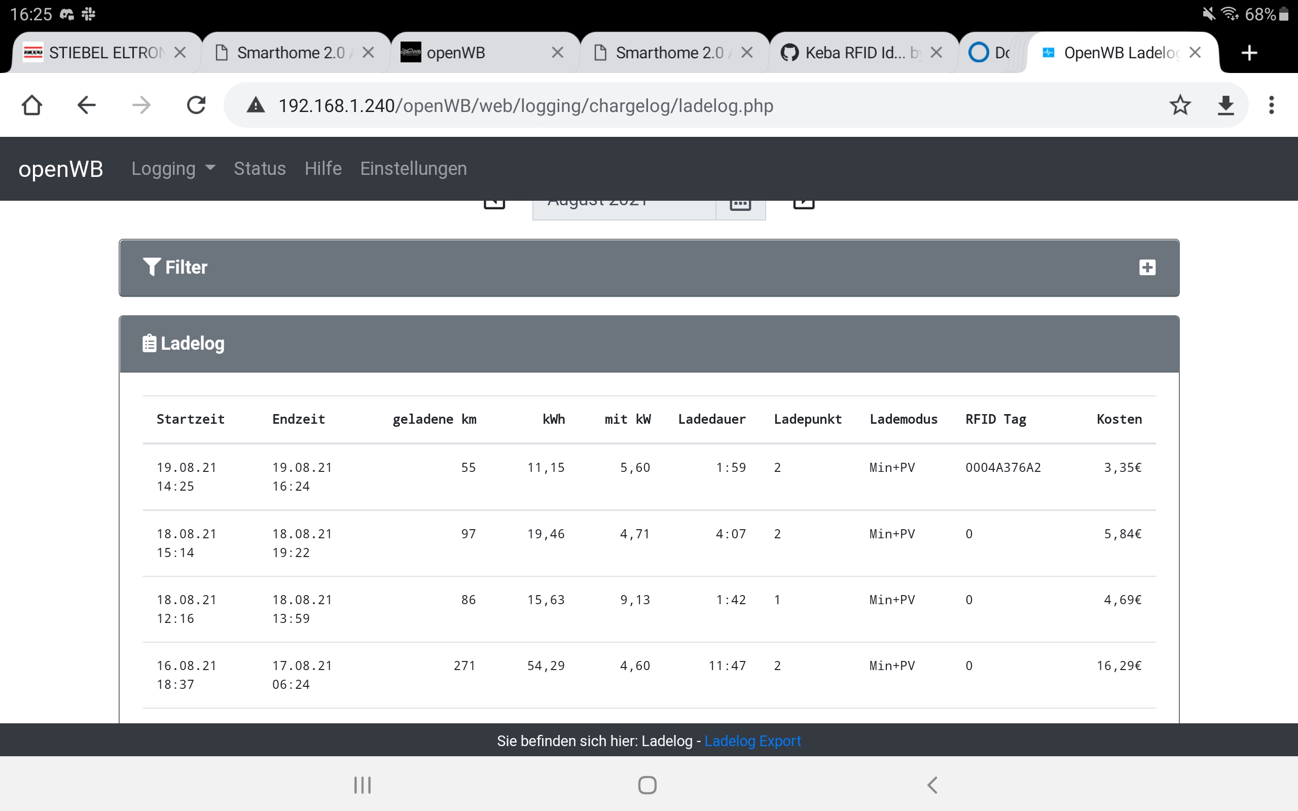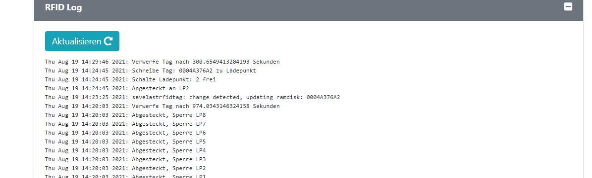 Und hier noch der entsprechende Ladelog Eintrag mit der rfid id