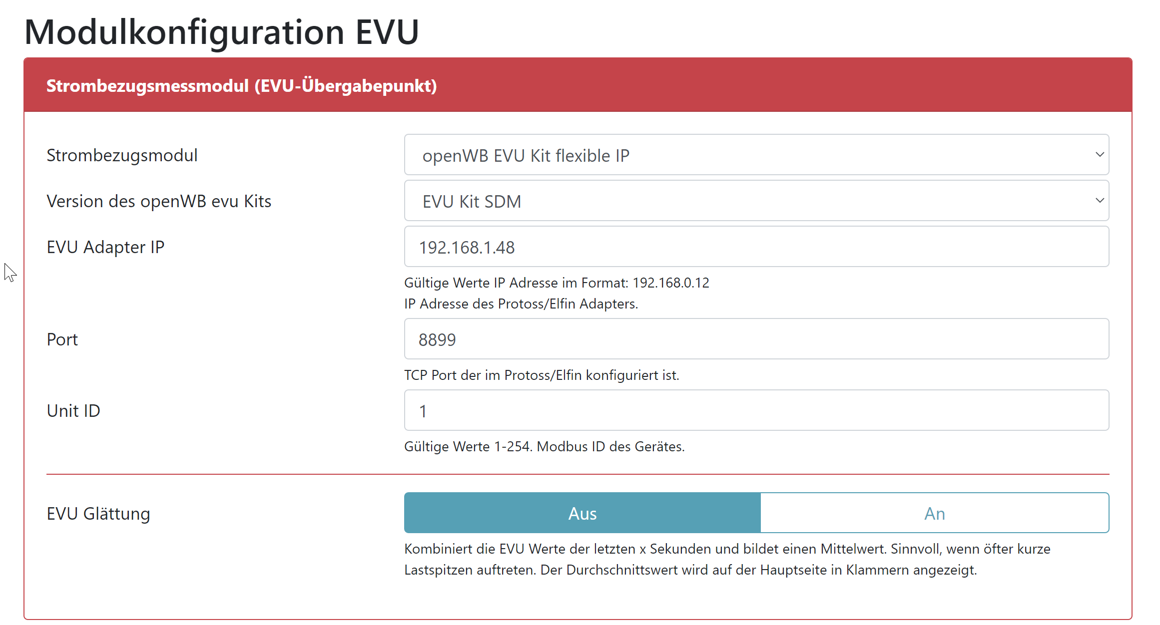 War das EVU- Kit aus dem Shop? Dann ist die IP im Adapter fest als "openWB- interne IP" eingestellt. Oder hast Du sie im Adapter geändert? Nur dann könntest Du sie als "flexibel" nutzen.fussi24@web.de hat geschrieben: Mo Okt 25, 2021 8:59 am Hallo Det,