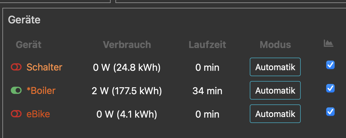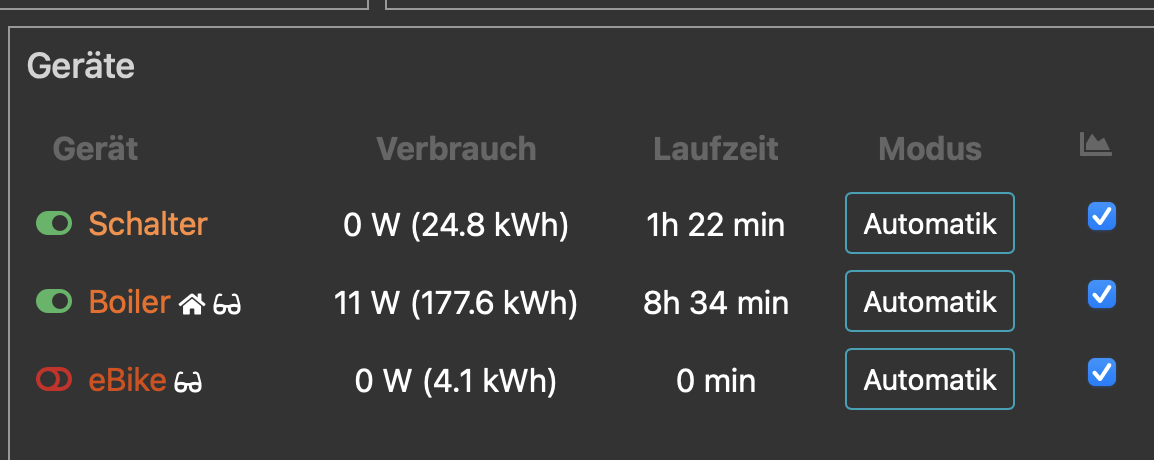 Ich habe ausserdem noch eine Markierung für Geräte, die zum Hausverbrauch zählen, eingebaut. Das Sternchen in der Geräteliste zeigt an, dass ein Gerät nicht separat gezählt wird: