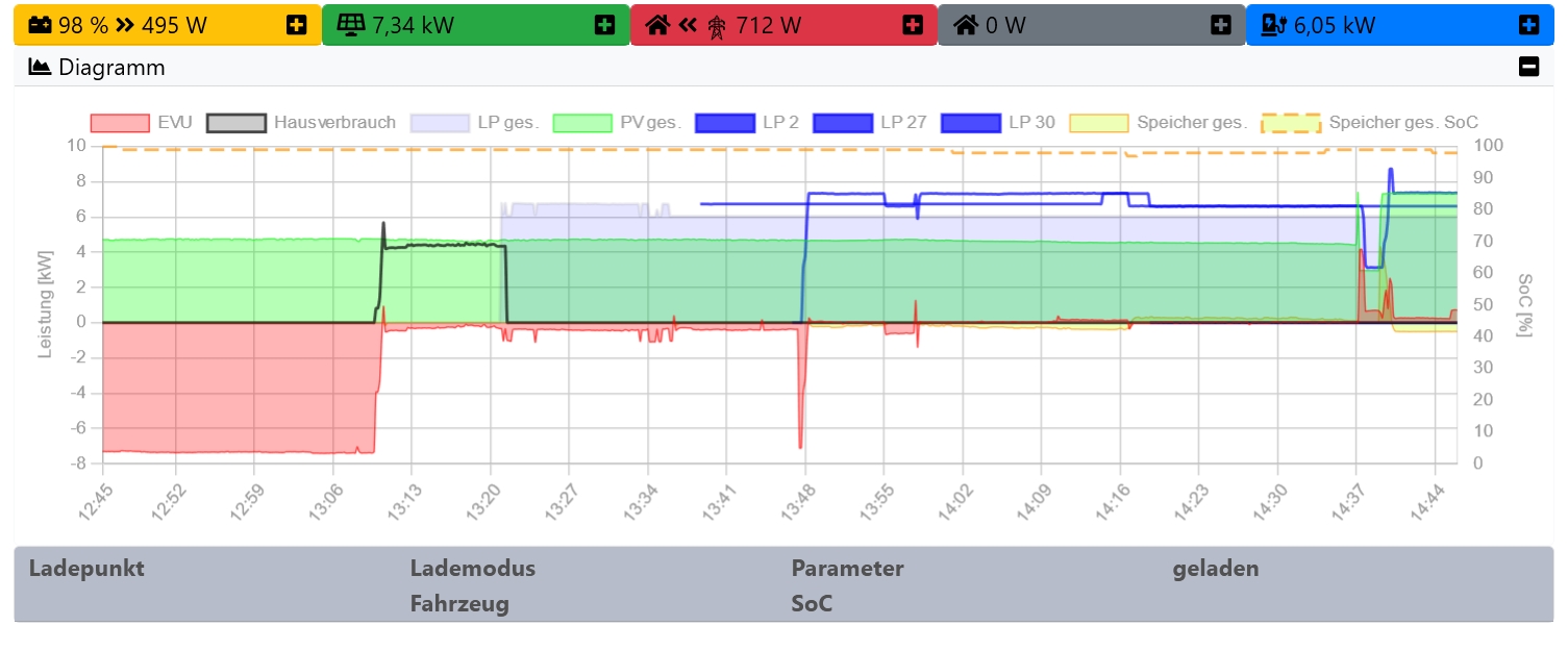 Ich nehme an, dass die Anzeige von Hausverbrauch und Ladestrom noch nicht programmiert sind, weil im Feld des Hausverbrauchs 0 und im blauen Anzeigefeld des ladestroms der Höchstwert des Tages stehen (sh. Dateianhang.