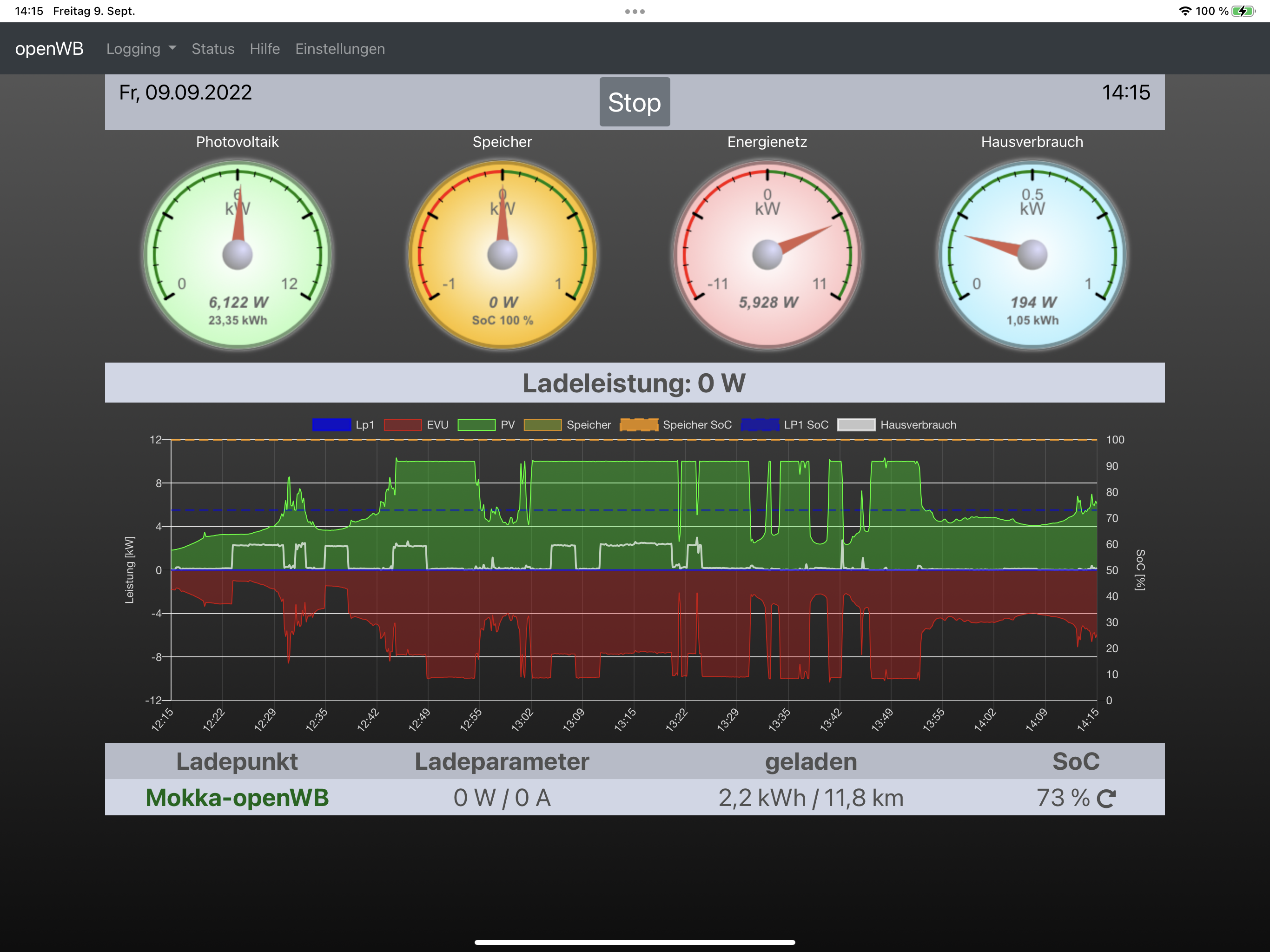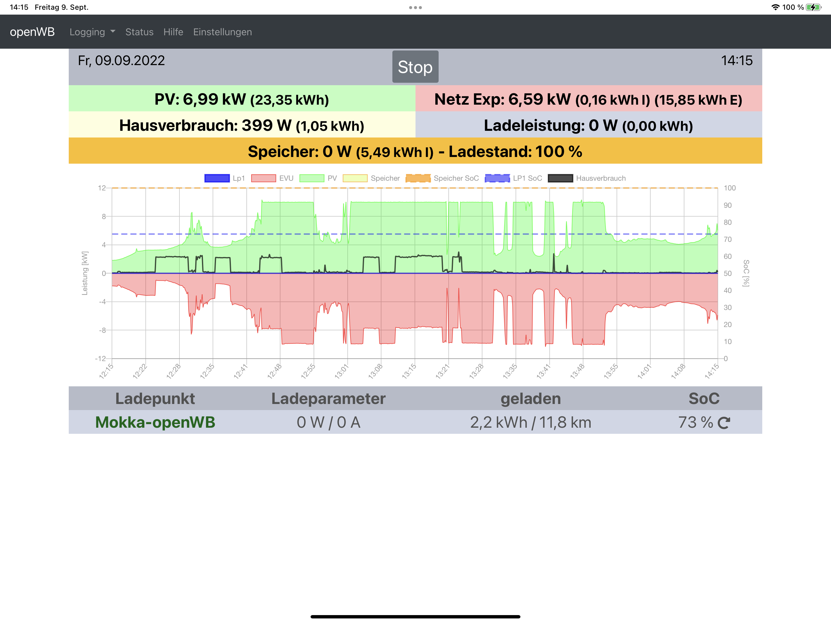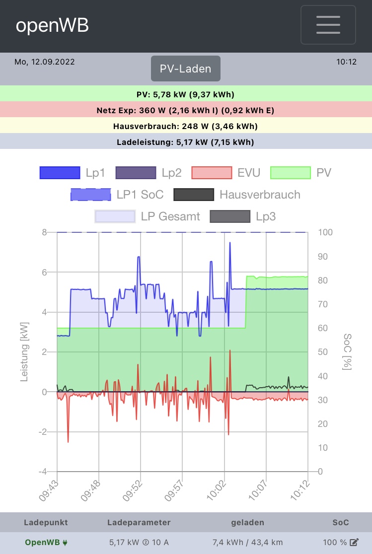 Zeitweise geht der Hausverbrauch scheinbar auf Null und der PV-Ertrag bleibt konstant, wobei die Laderegelung funktionieren zu scheint. Zum Beispiel siehe auch heute zwischen ca. 9:45 Uhr und 10:05 Uhr: