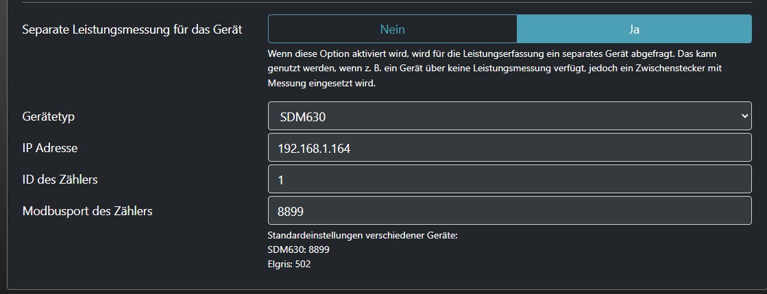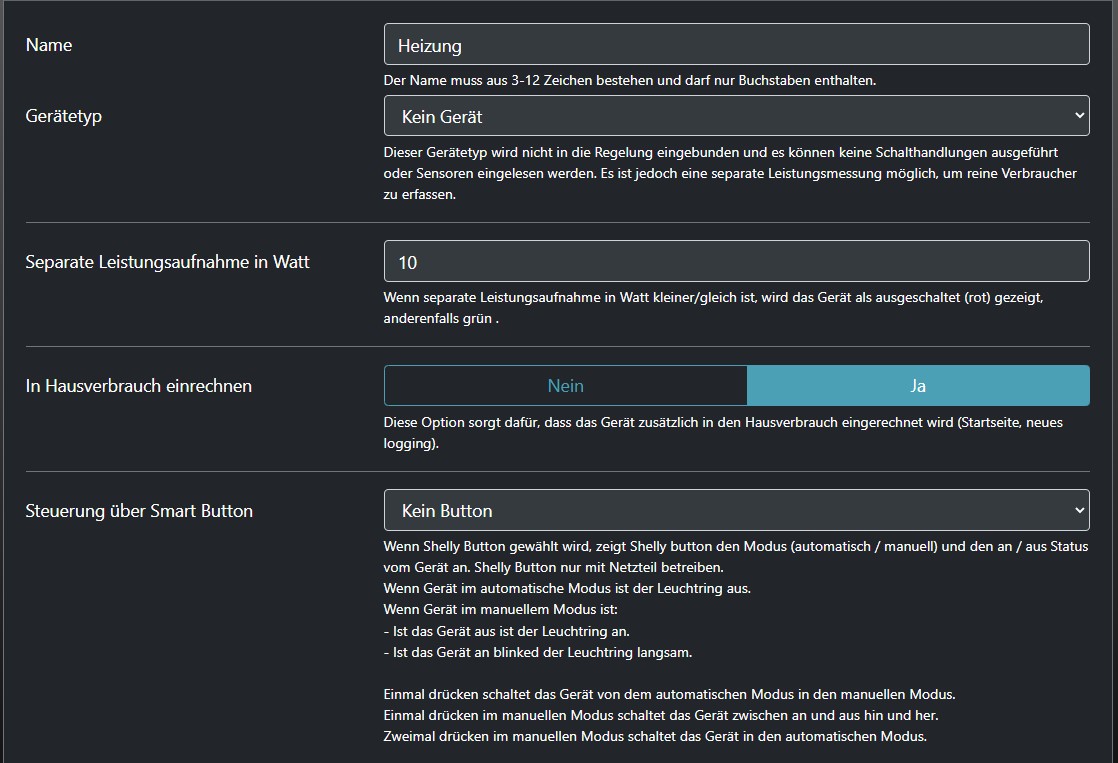 Dem muss ich gleich einen Verbesserungsvorschlag hinterherschicken, denn die bisherige Beschriftung lässt das Gegenteil dessen erwarten, was die Funktion tatsächlich macht, nämlich dass bei "Ja" die Geräteleistung zusätzlich zum Hausverbrauch addiert wird: