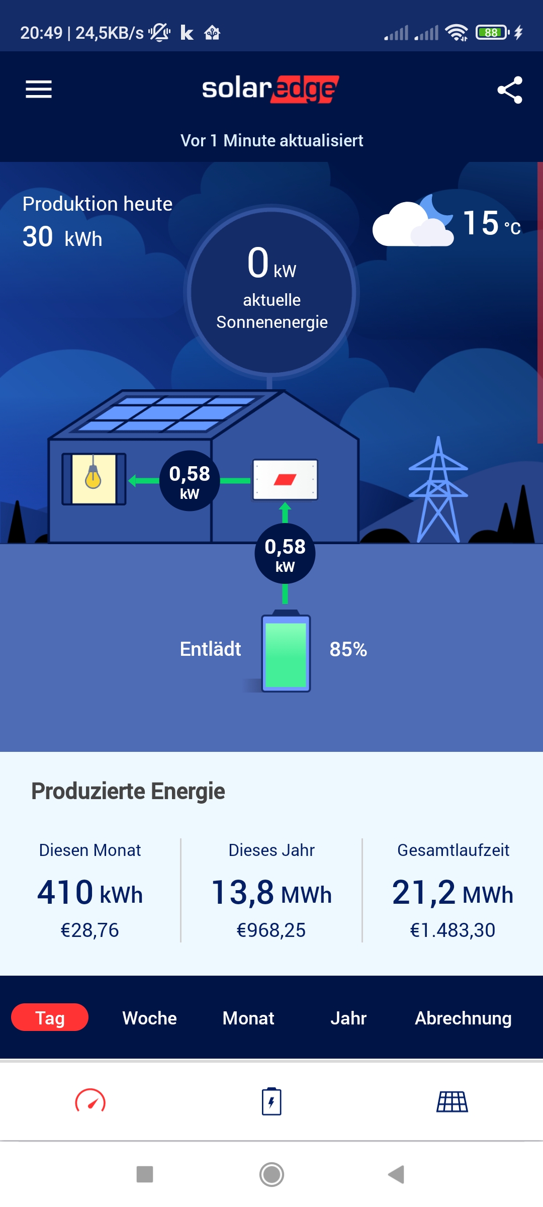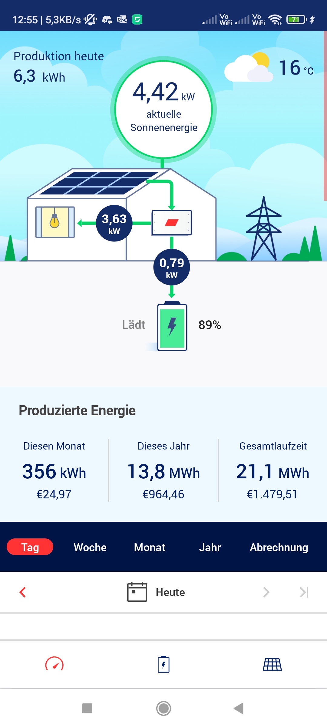 Also morgens, wenn der Speicher noch geladen wird, habe ich auch große Unterschiede, da die SE-App diese Energie nicht erfasst. Nach Sonnenuntergang steigt die Tagesproduktion in der SE-App weiter an, da der Speicher entladen wird.