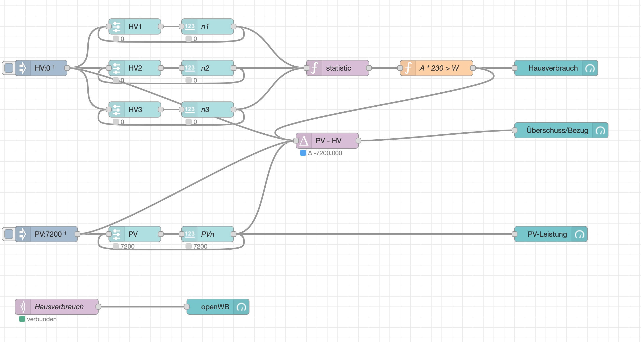 [{"id":"cf354afd.9bc818","type":"tab","label":"Haussimulation","disabled":false,"info":""},{"id":"5719608c.cb6d5","type":"ui_slider","z":"cf354afd.9bc818","name":"","label":"HV1","tooltip":"","group":"e4b1e54c.678138","order":2,"width":"4","height":"1","passthru":true,"outs":"all","topic":"HV1","topicType":"str","min":0,"max":"20","step":1,"className":"","x":270,"y":100,"wires":[["bbecace6.cf6118"]]},{"id":"4c4decd7.181c64","type":"ui_slider","z":"cf354afd.9bc818","name":"","label":"HV2","tooltip":"","group":"e4b1e54c.678138","order":4,"width":"4","height":"1","passthru":true,"outs":"all","topic":"HV2","topicType":"str","min":0,"max":"20","step":1,"className":"","x":270,"y":180,"wires":[["73c7b491.eca484"]]},{"id":"73c7b491.eca484","type":"ui_numeric","z":"cf354afd.9bc818","name":"n2","label":"","tooltip":"","group":"e4b1e54c.678138","order":5,"width":"2","height":"1","wrap":false,"passthru":true,"topic":"HV2","topicType":"str","format":"{{value}}","min":0,"max":"20","step":1,"className":"","x":410,"y":180,"wires":[["4c4decd7.181c64","61f39718.4707a"]]},{"id":"bbecace6.cf6118","type":"ui_numeric","z":"cf354afd.9bc818","name":"n1","label":"","tooltip":"","group":"e4b1e54c.678138","order":3,"width":"2","height":"1","wrap":false,"passthru":true,"topic":"HV1","topicType":"str","format":"{{value}}","min":0,"max":"20","step":1,"className":"","x":410,"y":100,"wires":[["5719608c.cb6d5","61f39718.4707a"]]},{"id":"73d4ae7a.9e5378","type":"ui_gauge","z":"cf354afd.9bc818","name":"","group":"e4b1e54c.678138","order":1,"width":0,"height":0,"gtype":"gage","title":"Hausverbrauch","label":"Watt","format":"{{value}}","min":0,"max":"13800","colors":["#00b500","#e6e600","#ca3838"],"seg1":"","seg2":"","className":"","x":1080,"y":180,"wires":[]},{"id":"33e16f4f.c097e8","type":"ui_slider","z":"cf354afd.9bc818","name":"","label":"HV3","tooltip":"","group":"e4b1e54c.678138","order":6,"width":"4","height":"1","passthru":true,"outs":"all","topic":"HV3","topicType":"str","min":0,"max":"20","step":1,"className":"","x":270,"y":260,"wires":[["c46e3ffe.11dc18"]]},{"id":"c46e3ffe.11dc18","type":"ui_numeric","z":"cf354afd.9bc818","name":"n3","label":"","tooltip":"","group":"e4b1e54c.678138","order":7,"width":"2","height":"1","wrap":false,"passthru":true,"topic":"HV3","topicType":"str","format":"{{value}}","min":0,"max":"20","step":1,"className":"","x":410,"y":260,"wires":[["33e16f4f.c097e8","61f39718.4707a"]]},{"id":"3b68517d.870aae","type":"inject","z":"cf354afd.9bc818","name":"","props":[{"p":"payload"},{"p":"topic","vt":"str"}],"repeat":"","crontab":"","once":true,"onceDelay":0.1,"topic":"HV","payload":"0","payloadType":"num","x":90,"y":180,"wires":[["5719608c.cb6d5","4c4decd7.181c64","33e16f4f.c097e8","5fca2631.32d338"]]},{"id":"967fc91e.c1e34","type":"ui_slider","z":"cf354afd.9bc818","name":"","label":"PV","tooltip":"","group":"1de0097c.41aea7","order":2,"width":"4","height":"1","passthru":true,"outs":"all","topic":"PV","topicType":"str","min":0,"max":"13000","step":"100","className":"","x":270,"y":500,"wires":[["7ed00085.af4438"]]},{"id":"7ed00085.af4438","type":"ui_numeric","z":"cf354afd.9bc818","name":"PVn","label":"","tooltip":"","group":"1de0097c.41aea7","order":3,"width":"3","height":"1","wrap":false,"passthru":true,"topic":"PV","topicType":"str","format":"{{value}}","min":0,"max":"13000","step":"100","className":"","x":410,"y":500,"wires":[["967fc91e.c1e34","5fca2631.32d338","49e4bb93.e612c4"]]},{"id":"49e4bb93.e612c4","type":"ui_gauge","z":"cf354afd.9bc818","name":"","group":"1de0097c.41aea7","order":1,"width":0,"height":0,"gtype":"gage","title":"PV-Leistung","label":"Watt","format":"{{value}}","min":0,"max":"13000","colors":["#e6e600","#e6e600","#e6e600"],"seg1":"","seg2":"","className":"","x":1070,"y":500,"wires":[]},{"id":"a28ea702.28953","type":"ui_gauge","z":"cf354afd.9bc818","name":"","group":"5dcc2e5f.f76a9","order":8,"width":0,"height":0,"gtype":"gage","title":"Überschuss/Bezug","label":"Watt","format":"{{value}}","min":"-13800","max":"13800","colors":["#00f900","#00f900","#ff2600"],"seg1":"100","seg2":"100","className":"","x":1090,"y":300,"wires":[]},{"id":"61f39718.4707a","type":"combine-statistic","z":"cf354afd.9bc818","name":"","topic":"HV","operator":"sum","falsy":"include","defer":250,"timeout":0,"distinction":"topic","x":660,"y":180,"wires":[["1ac0d787.7324c8"]]},{"id":"5fca2631.32d338","type":"combine-delta","z":"cf354afd.9bc818","topic":"","topicA":"HV","topicB":"PV","name":"PV - HV","x":640,"y":320,"wires":[["a28ea702.28953"]]},{"id":"1ac0d787.7324c8","type":"function","z":"cf354afd.9bc818","name":"A * 230 > W","func":"msg.payload = msg.payload * 230;\nreturn msg;","outputs":1,"noerr":0,"initialize":"","finalize":"","x":850,"y":180,"wires":[["73d4ae7a.9e5378","5fca2631.32d338"]]},{"id":"e1fc2a5a.4cf05","type":"inject","z":"cf354afd.9bc818","name":"","props":[{"p":"payload"},{"p":"topic","vt":"str"}],"repeat":"","crontab":"","once":true,"onceDelay":0.1,"topic":"PV","payload":"7200","payloadType":"num","x":100,"y":500,"wires":[["967fc91e.c1e34","5fca2631.32d338"]]},{"id":"ed5b83b7.d1883","type":"mqtt in","z":"cf354afd.9bc818","name":"Hausverbrauch","topic":"openWB/global/WAllChargePoints","qos":"2","datatype":"auto","broker":"978968c8.7b5238","x":120,"y":640,"wires":[["77fdf7a5.1417b"]]},{"id":"77fdf7a5.1417b","type":"ui_gauge","z":"cf354afd.9bc818","name":"","group":"9545499f.a61ca8","order":0,"width":0,"height":0,"gtype":"gage","title":"openWB","label":"watt","format":"{{value}}","min":0,"max":"11000","colors":["#00b500","#00b500","#00b500"],"seg1":"","seg2":"","className":"","x":430,"y":640,"wires":[]},{"id":"e4b1e54c.678138","type":"ui_group","name":"Hausverbrauch","tab":"744b5117.d18b28","order":2,"disp":false,"width":"7","collapse":false,"className":""},{"id":"1de0097c.41aea7","type":"ui_group","name":"PV Produkion","tab":"744b5117.d18b28","order":1,"disp":false,"width":"7","collapse":false,"className":""},{"id":"5dcc2e5f.f76a9","type":"ui_group","name":"Überschuss","tab":"744b5117.d1