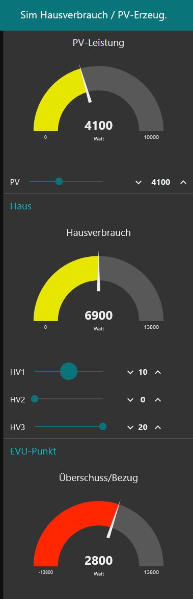 Ich hab' mal weitergebaut: Ich kann nun die PV-Leistung verdrehen und den Hausverbrauch einstellen. Raus kommt wenig überraschend die Leistung am EVU-Punkt. Und ganz unten schon mal die Geamt-Ladeleistung der openWB.