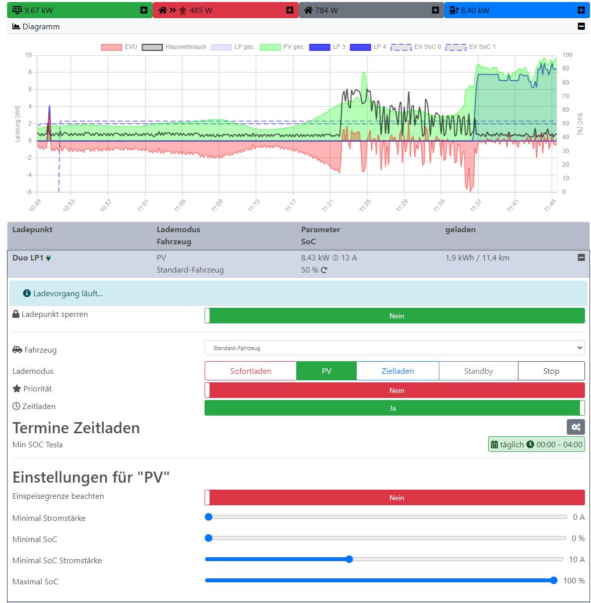 danke, Sofortladen funktioniert nun wieder. Auch PV laden wird gestartet, wird aber sofort wieder beendet. Ich denke aber aufgrund zu wenig PV Leistung. Hab das Limit zum testen auf 50W Überschuss gestellt.