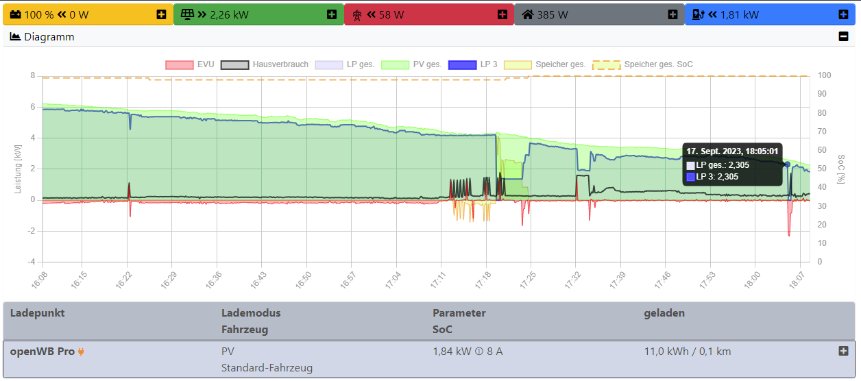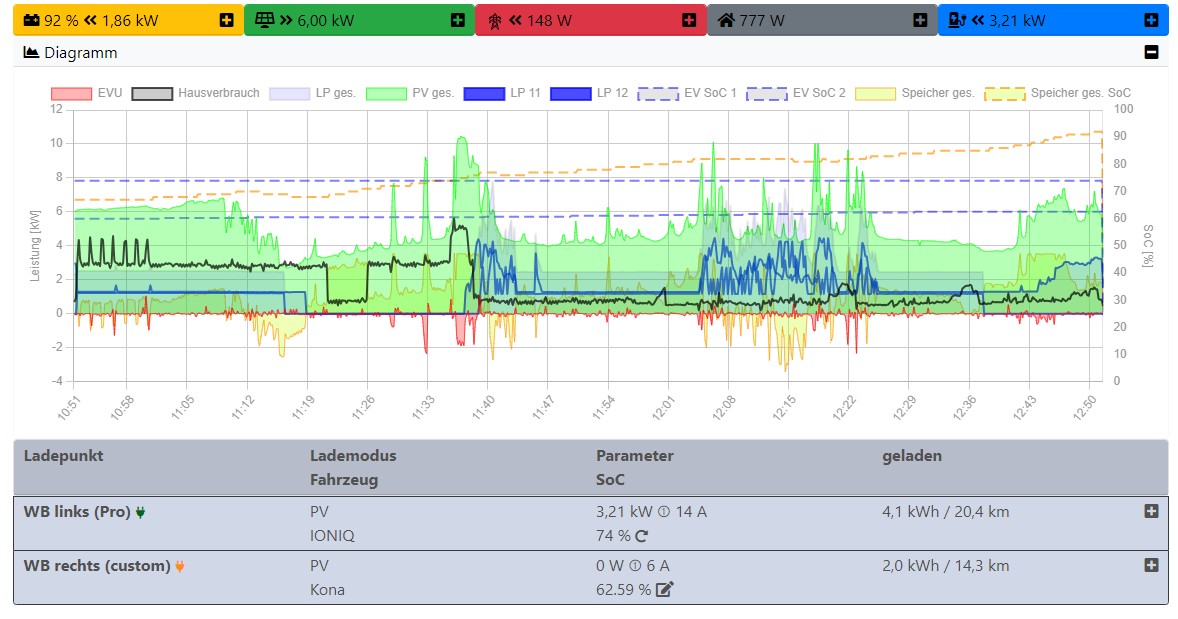 Ok, einmal "aus" und wieder "an" hat tatsächlich den gewünschten Erfolg gebracht. Jetzt habe ich nur mehr das Problem der sehr unsauberen und sehr schwankenden Regelung, wenn zwei Autos laden, siehe auch Screenshot.