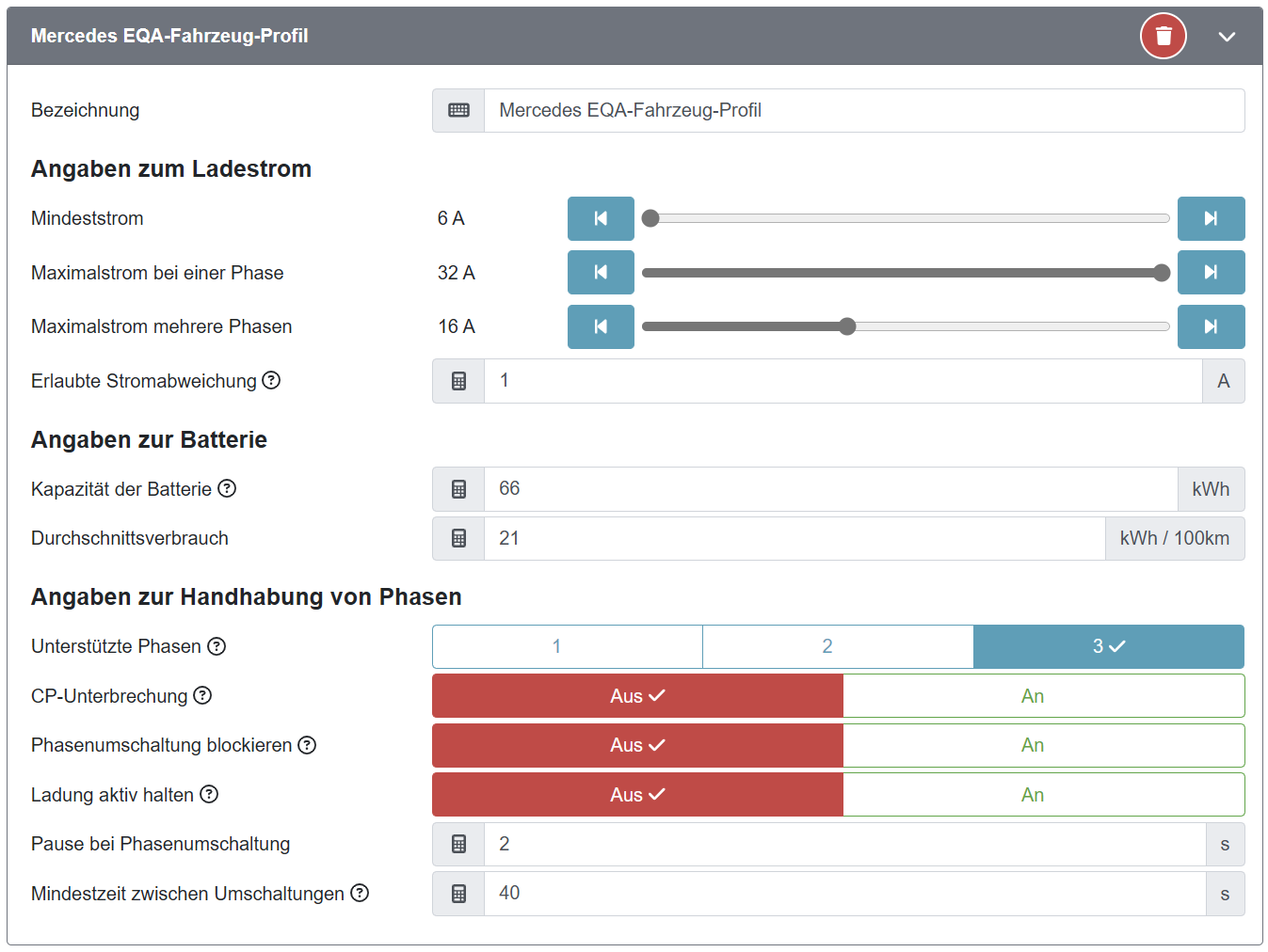 Es war genauso eingestellt, wie es sein muss: Die Wallbox ist dreiphasig mit 32 A abgesichert, daher im Ladepunkt-Profil 32 A sowohl für ein- als auch dreiphasig. Das Fahrzeug kann einphasig 32 A oder dreiphasig 16 A laden - das ist auch genau so im Fahrzeugprofil gespeichert.
